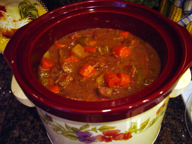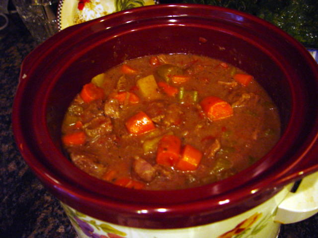 Stir all ingredients together in slow cooker/crockpot. Cover and cook all day on low. Stir gently and serve with green veggies.