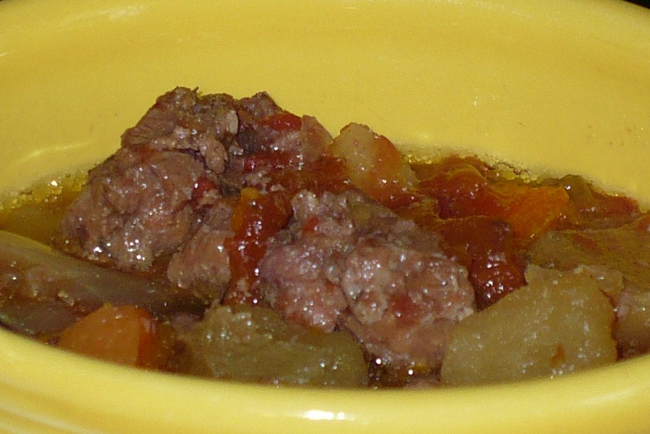1 lb beef stew meat 4 carrots, cut in chunks 1 onion, chopped 2 -3 stalks celery, cut in chunks 2 -3 medium potatoes, cut in chunks 1 medium turnip, cut in small chunks or diced 1 (14 1/2 ounce) can whole tomatoes or (14 1/2 ounce) can stewed tomatoes, undrained 1 dash thyme 1 dash oregano 1 pinch salt or 1 pinch salt substitute 1 low-sodium beef bouillon cube 1 1?2 cups water