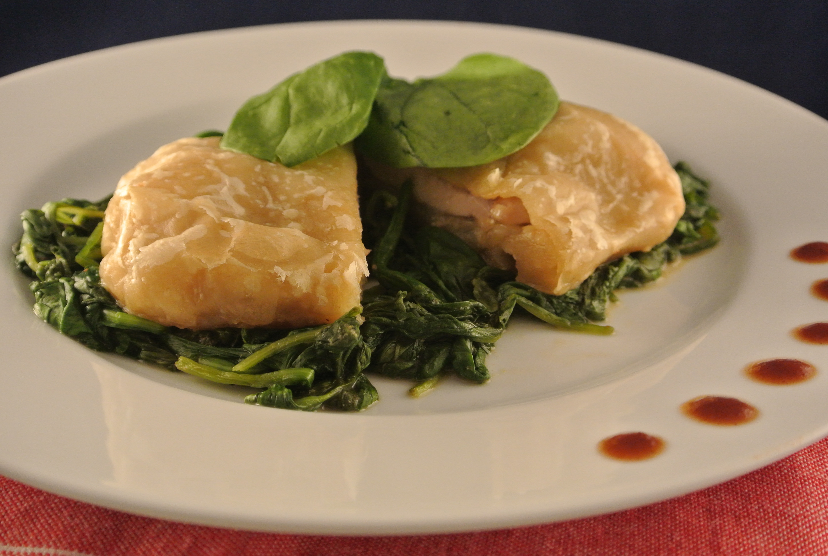 Lay out 2 sheets of thawed puff pastry and divide each in half with a knife. In a small bowl mix 2 tablespoons of Dijon mustard and 2 tablespoons of A1 sauce and coat the 4 chicken thighs with this mixture. Place the chicken thighs on each of the pastry sheets and wrap each to completely cover, pinching the seams as you go. Place on a baking sheet lined with parchment paper seams side down and place in an oven preheated to 375 degrees for 35 minutes. While the chicken pockets are baking begin your spinach. Mix 2 tablespoons of A1 sauce and the other 2 tablespoons of Dijon mustard in a small bowl and place in a hot skillet along with the 6 cups of spinach minus a few leaves for garnish and cook while stirring frequently until dark and moist. 6 or 7 minutes. To plate lay down a bed of spinach and place your chicken pocket on top. Garnish with some uncooked spinach and use the other tablespoon of A1 in a squirt bottle to decorate the rim of the plates.