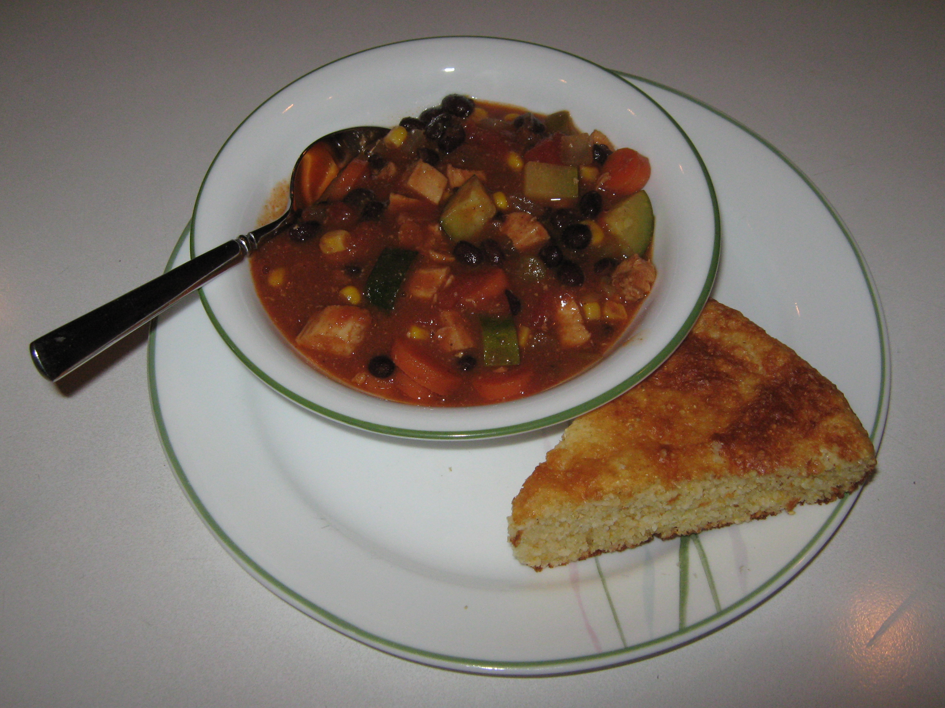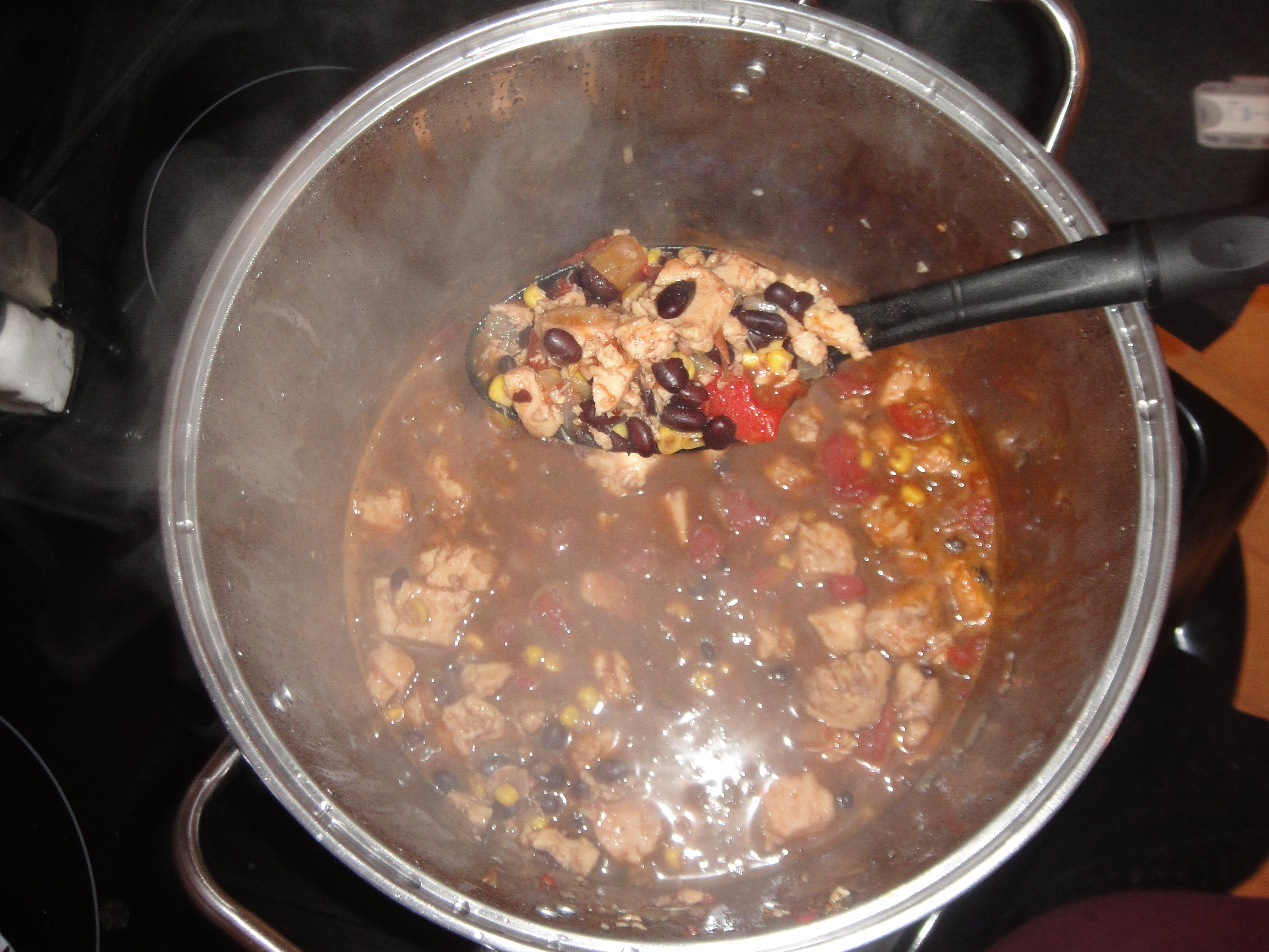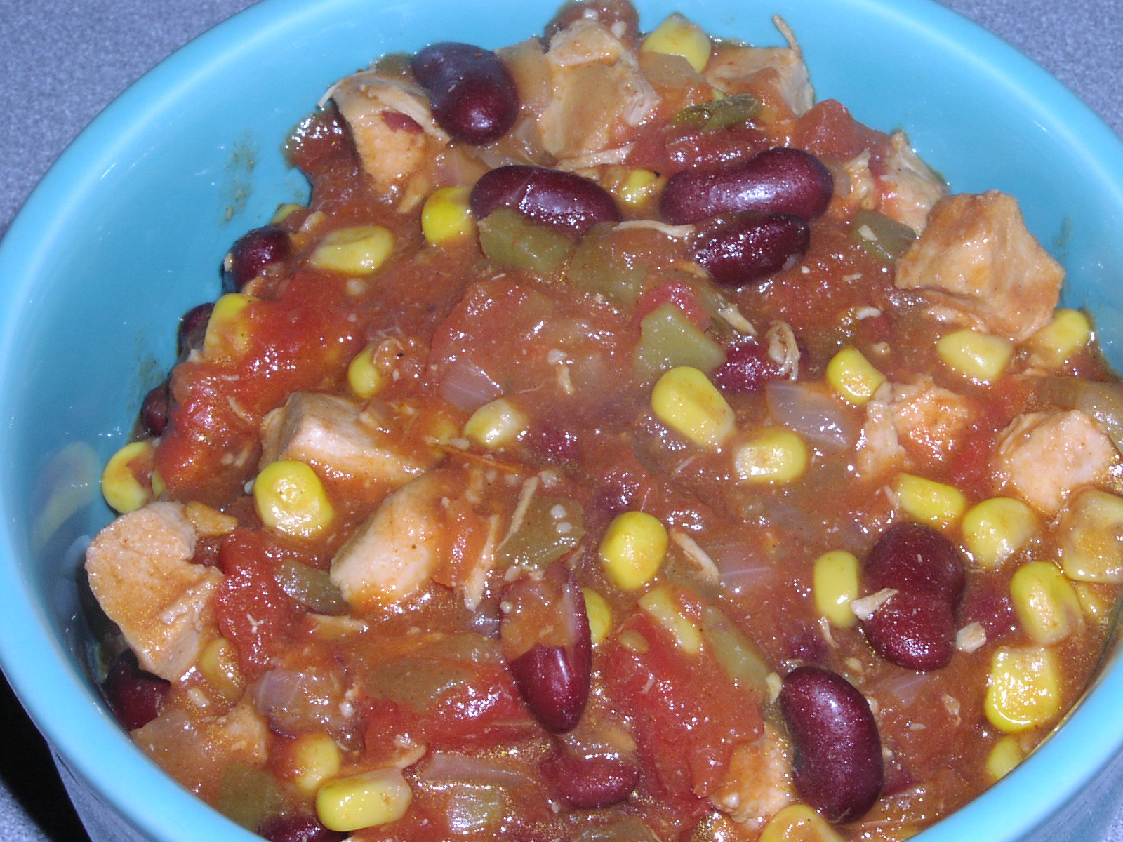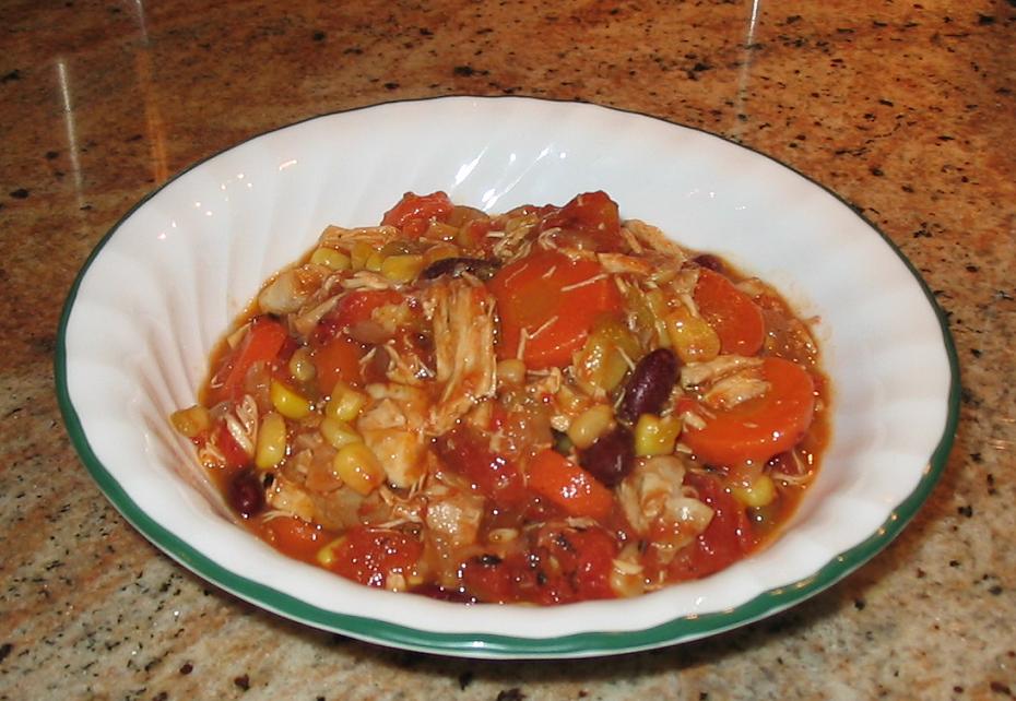 1 cup diced onion 1 -2 garlic clove, finely chopped 1 tablespoon olive oil 3 cups cooked chicken or 3 cups cooked turkey, diced or shredded 1 (1 1/4 ounce) package taco seasoning mix 2 (14 1/2 ounce) cans ready-cut diced tomatoes, undrained 1 (15 ounce) can black beans or (15 ounce) can kidney beans, drained 1 (8 3/4 ounce) can whole kernel corn, drained 1 (4 ounce) can diced green chilies, drained 1 cup chicken broth 1?2 tablespoon cornstarch