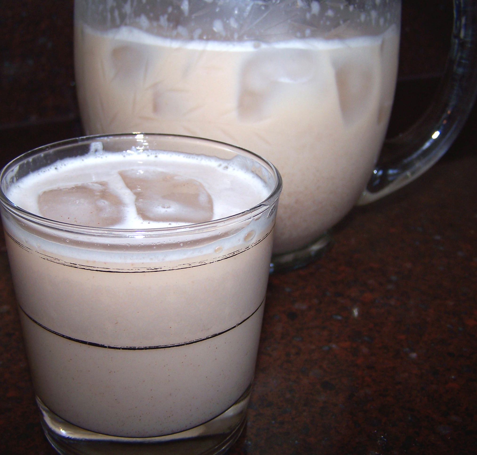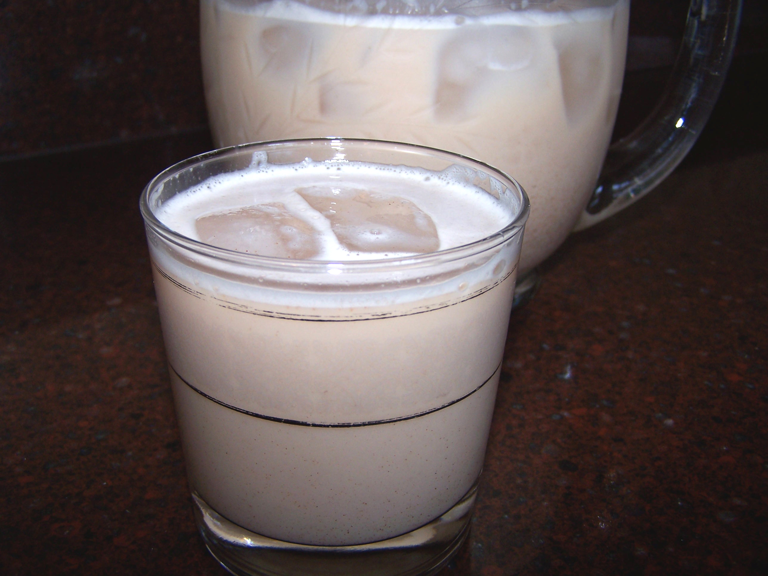 Rinse the rice in a colander. Place in a blender and add enough water to cover by an inch; soak 5 or 10 minutes. Add the vanilla and cinnamon and blend until finely ground. Drain the liquid through colander into a pitcher. Return the ground rice to the blender. Add the condensed milk and about 2 cups water and blend again. Drain into the pitcher. Discard any remaining rice. Add more water to the pitcher, one cup at a time, until it has the right amount of sweetness for you. Add ice and serve cold. Note: you can add 1 cup sugar or so and 1 cup milk, instead of the sweetened condensed milk . I suppose you could use rice or even soy milk, but I haven't tried it.
