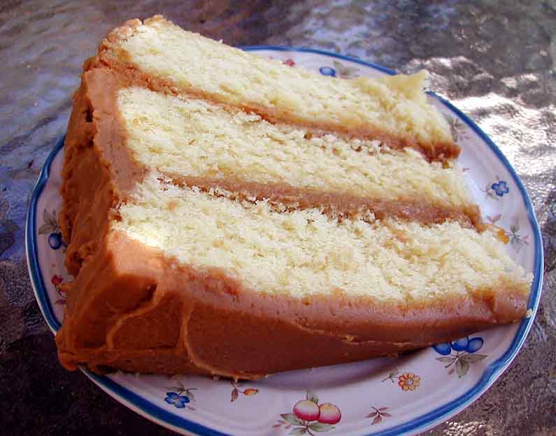 Preheat oven to 350 degrees. Grease three 9-inch-round cake pans. Line bottoms with waxed paper. Grease paper, and flour insides of pans. Combine flour and baking powder in bowl. Beat butter and sugar in another bowl at medium speed until smooth. Add eggs, beating until smooth. At low speed, alternately beat in four mixture and milk. Beat in vanilla. Scrape into prepared pans, dividing evenly. Bake in 350-degree oven 20 to 25 minutes or until wooden pick comes out clean. Cool in pans on wire racks 10 minutes. Remove cakes from pans and cool completely on racks. Meanwhile, prepare icing. *NOTE: The recipe states that "although the amount of icing seems small, it is enough to frost the cake. If you wish, the recipe may be doubled." I've found this to be true, but I recommend that you either double it or make a batch & a half, which is what I do. Melt butter in saucepan over low heat. Add brown sugar and milk Bring to boiling, stirring to dissolve sugar. Remove from heat. Cool. Beat confectioners' sugar into milk mixture until smooth. Frost and stack cake layers on cake plate, spreading 1/3 cup icing between each layer. Frost top and sides of cake with remaining icing.