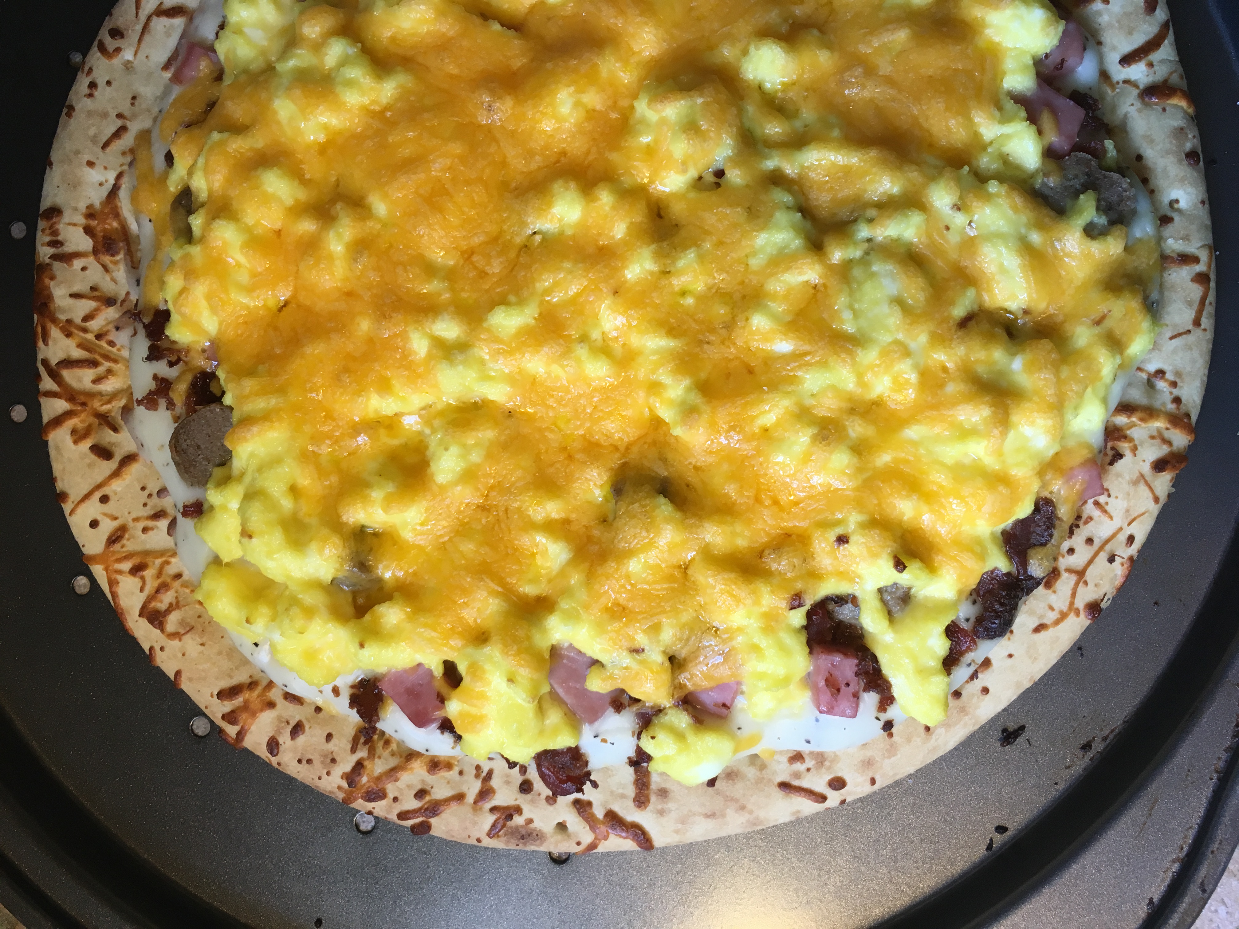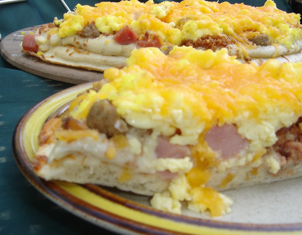 1 prebaked refrigerated 12-inch pizza crust, at room temperature 1 (2 1/2 ounce) package country gravy mix 1 cup milk 1 cup water 1 cup chopped sausage links, cooked 1 cup chopped ham, cooked 1 cup bacon bits, cooked 1?2 cup milk 2 tablespoons margarine 8 eggs 1 1?2 cups shredded cheddar cheese