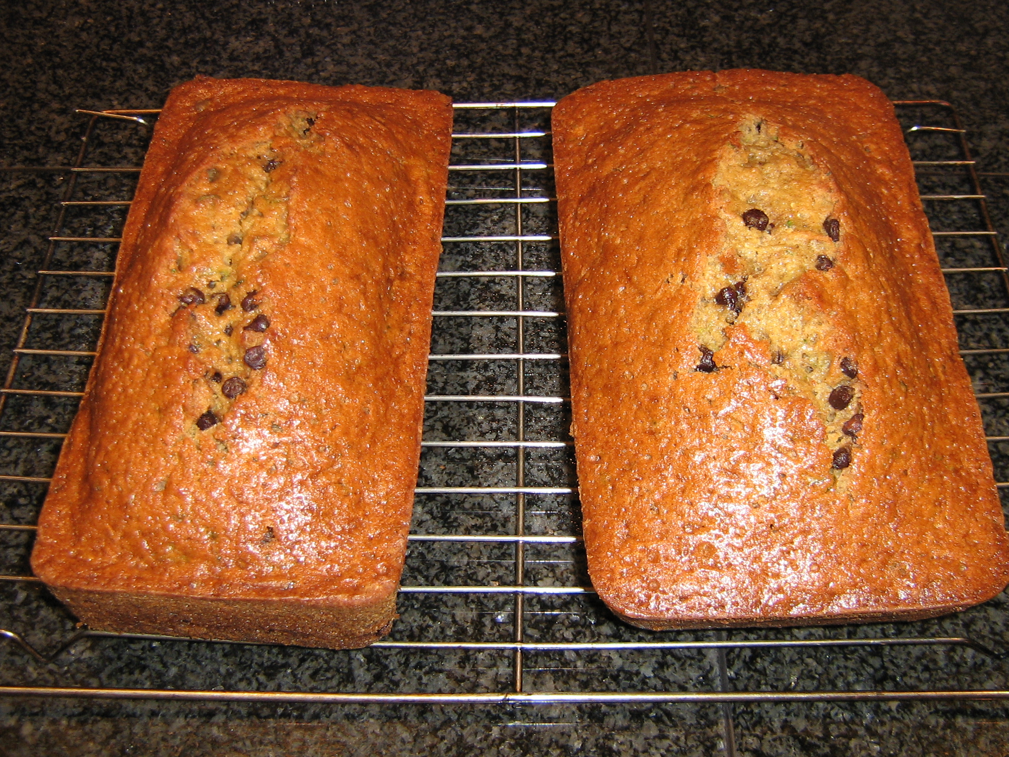 6 eggs 4 cups sugar 2 cups oil 4 -5 cups zucchini, shredded 6 cups flour 2 teaspoons baking soda 1 teaspoon baking powder 2 teaspoons salt 1 tablespoon cinnamon 1 tablespoon vanilla 1 (12 ounce) package miniature chocolate chips