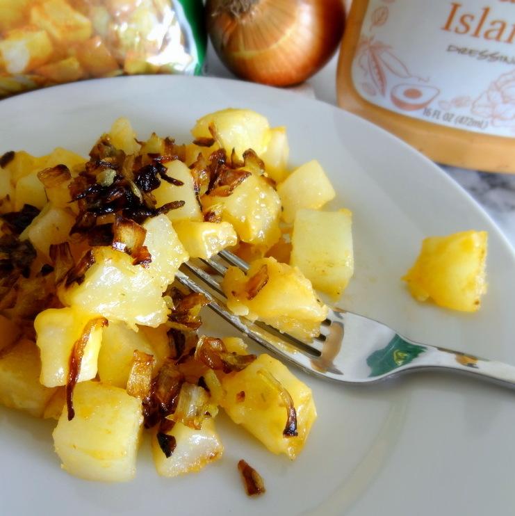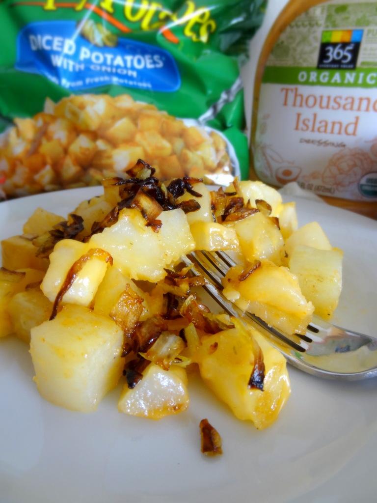 1 (20 ounce) package Simply Potatoes Diced Potatoes with Onion 1 medium yellow onion, finely chopped 4 tablespoons olive oil, divided 1?3 cup thousand island dressing 3 slices American cheese