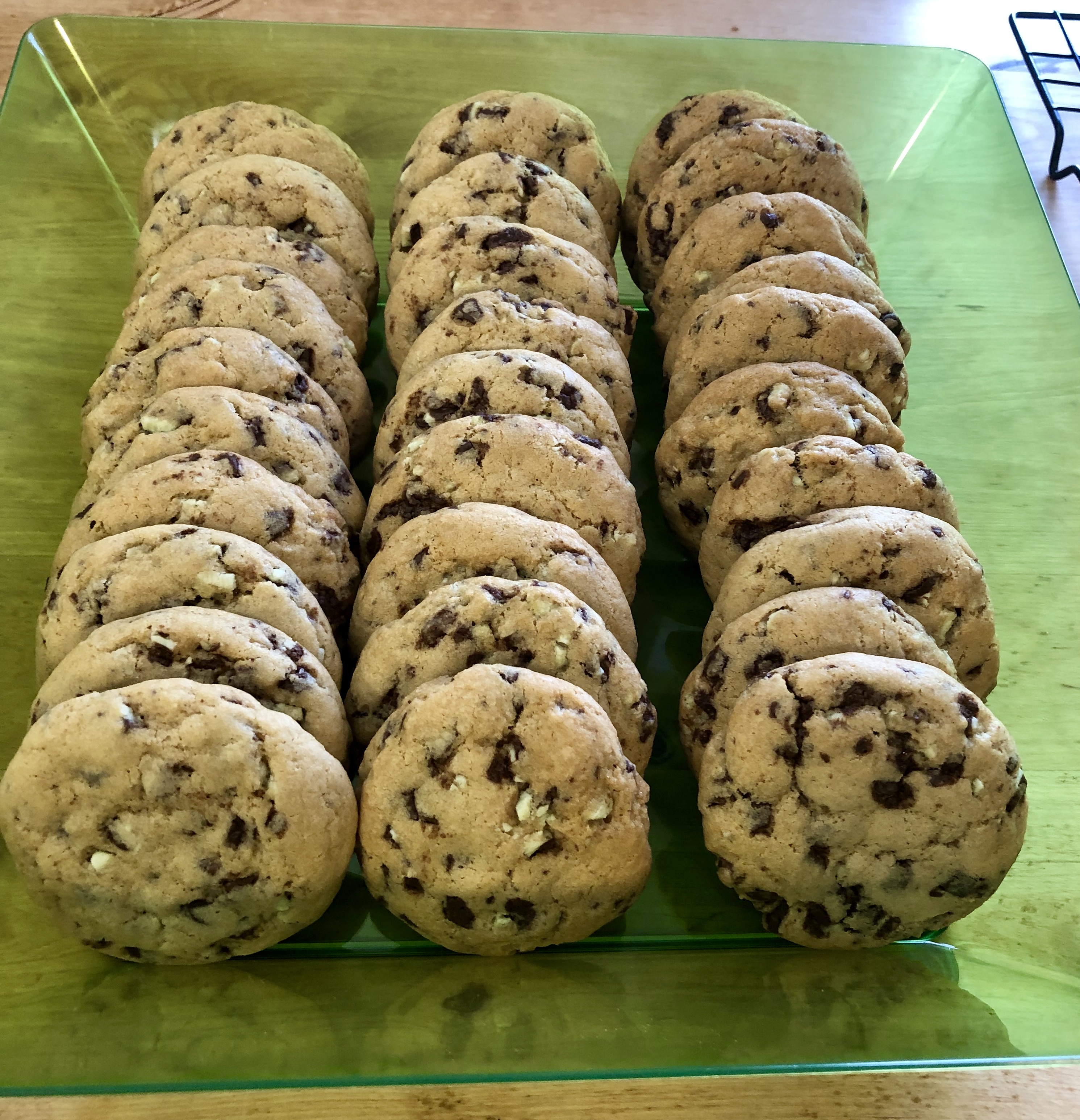 Preheat oven to 350F Do not do this until after dough has been refrigerated. Blend butter, brown sugar, white granulated sugar, baking soda, baking powder, vanilla and eggs until ingredients are mixed. Add Andes Baking Chips and mix. Add Flour and continue to mix until all ingredients are well blended together. Cover and chill in the refrigerator for 45-60 minutes. Spoon out approximately 1 oz of dough per cookie. Form a ball and then slightly flatten. Place on non-stick baking pans and bake for approximately 8-10 minutes. Cool on pans for 2 minutes, then remove.