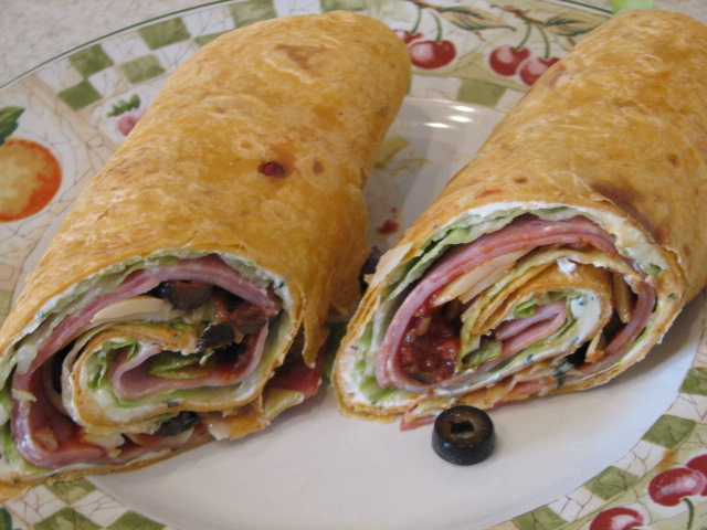 Mix cream cheese with the basil and garlic. On each tortilla, spread about 2 tablespoons of this mixture on the tortillas to within 1/4 inch of the edge. Layer with romaine, salami, ham, and cheese. Next, layer on the olives, roasted red peppers, and artichoke hearts that you prefer. Tightly roll up the tortilla and cut in half on the diagonal. Enjoy!