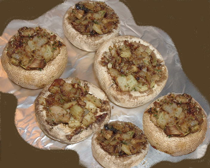8 ounces fresh mushrooms (try to use large mushrooms) 3 tablespoons butter 1?4 cup celery, chopped 1?4 cup onion, chopped 1?4 cup dry breadcrumbs 1 teaspoon Worcestershire sauce 1 teaspoon parsley flakes 1?4 teaspoon salt 1?8 teaspoon oregano