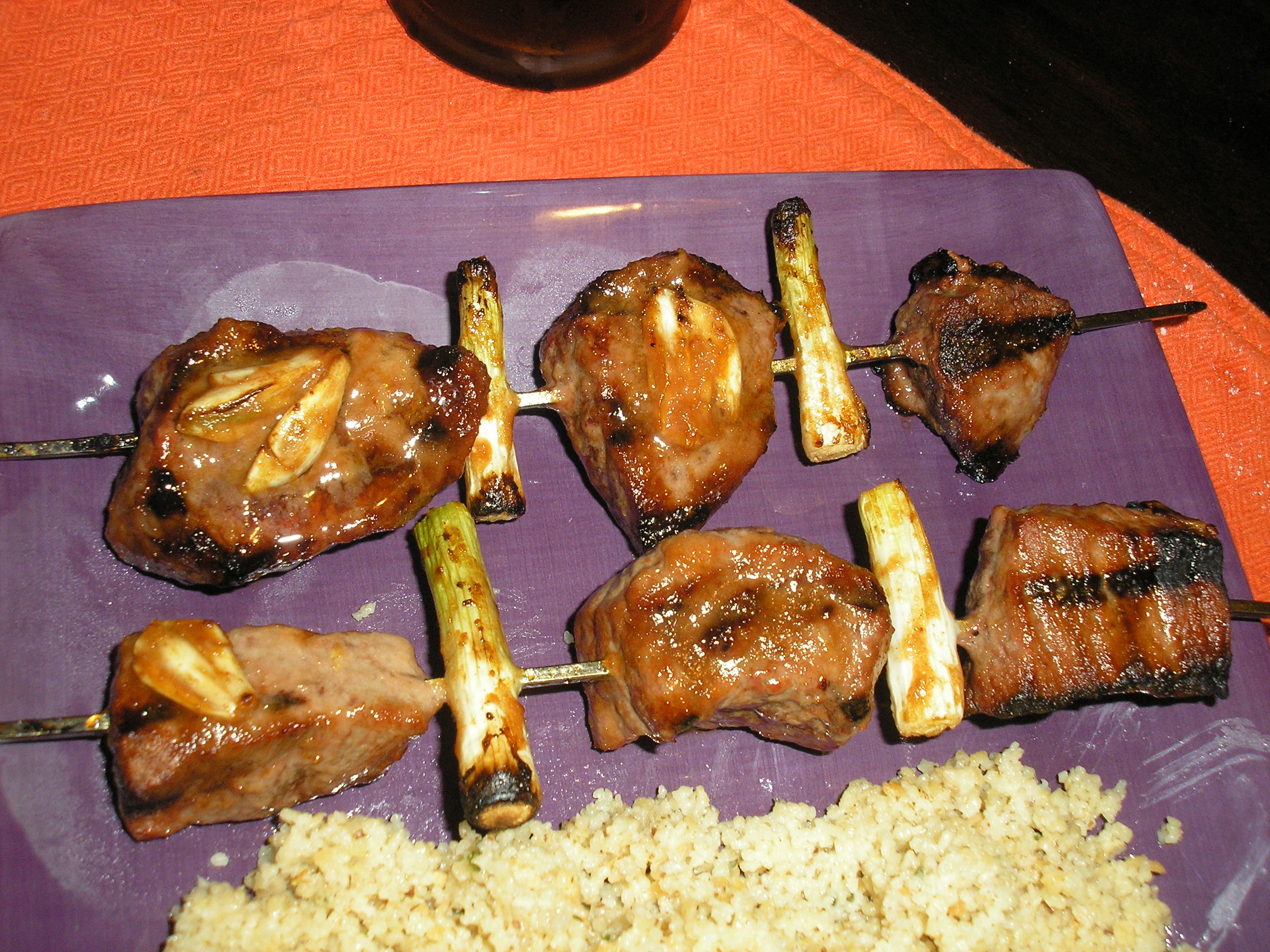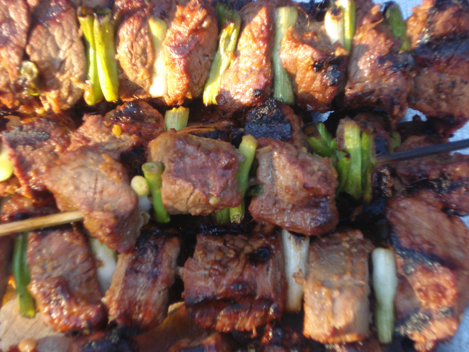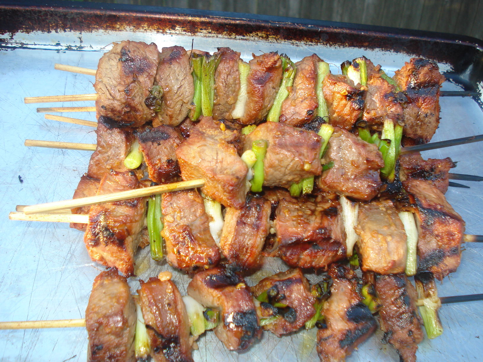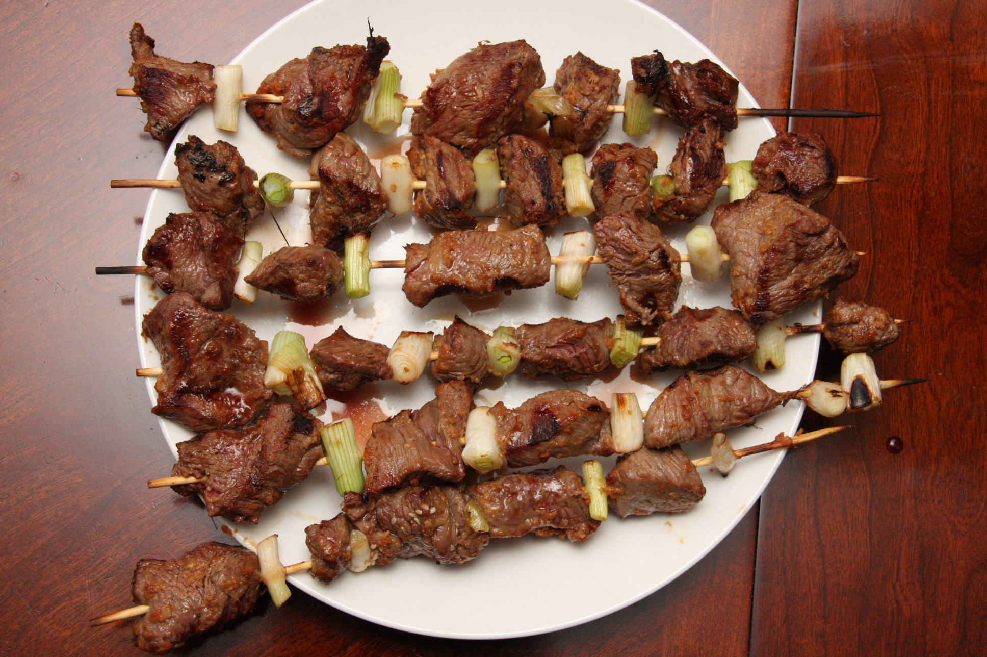 In a large bowl, mix garlic, ginger, soy sauce, vinegar, oil and sugar. Remove the fat from the steak and cut the meat in dices of 1 inch. Add beef to the marinade and let rest for 10 minutes. On metal skewers or presoaked bamboo skewers, thread beef cubes by alternating with green onion. Set the barbecue to medium high. Brush the beef skewers with the marinade and put on a oiled grill of the barbecue. Close cover and cook about 10 minutes or until beef is grilled but still pink inside (flip the skewers 3 times during cooking time).