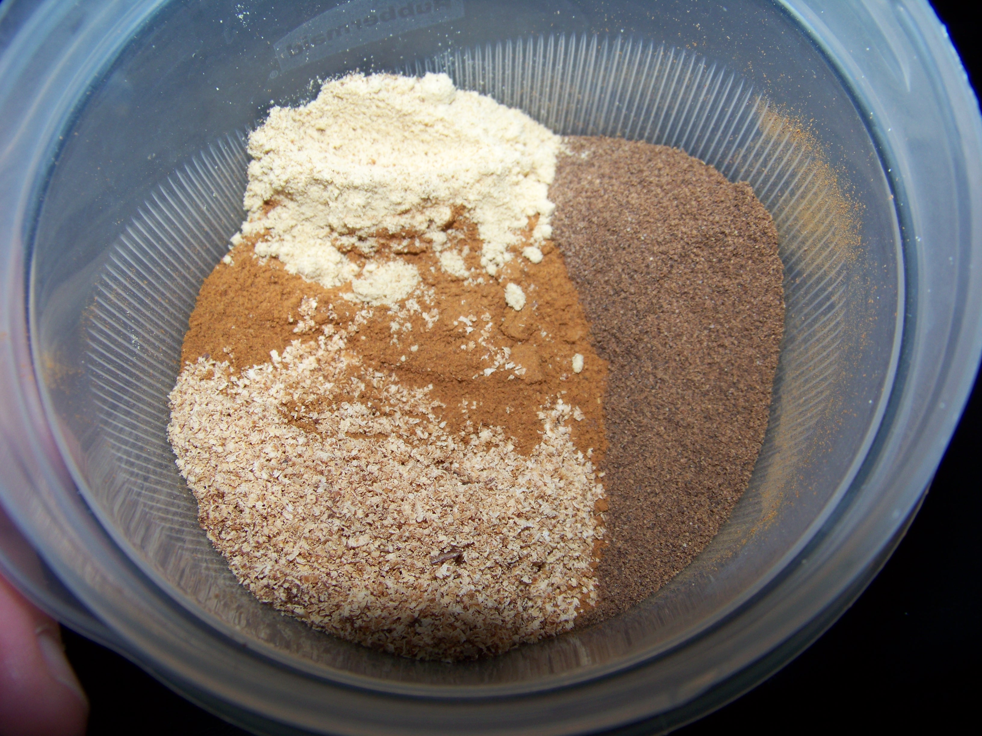 Fresh grind your own nutmeg. Once you grind the nutmeg, it should be used in about a month. Mix together and store in spice container.