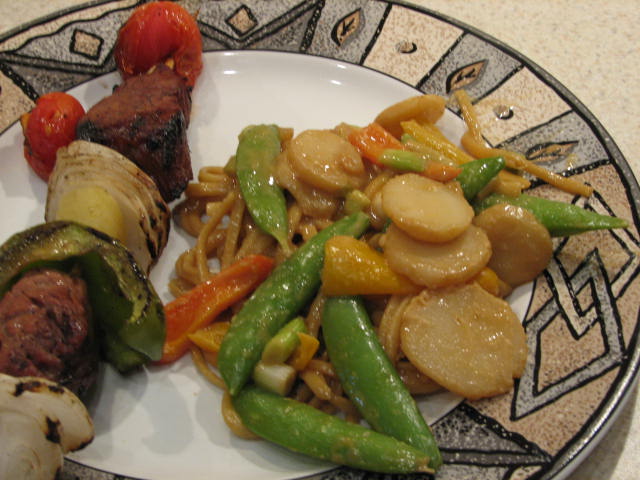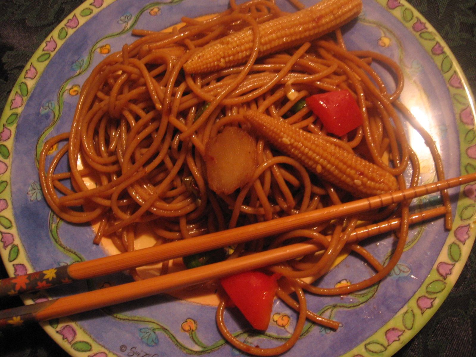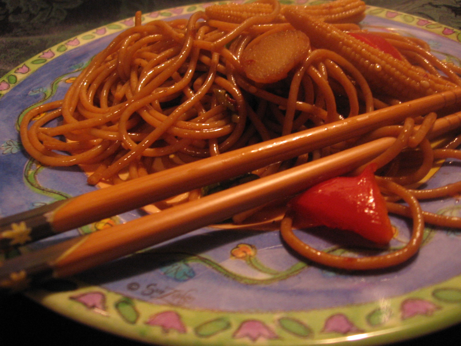 3?4 cup rice wine vinegar 1?3 cup low sodium soy sauce 1?3 cup honey 1 1?2 tablespoons minced fresh ginger 2 tablespoons dark sesame oil 1 1?2 tablespoons asian chili-garlic sauce 1 lb cooked spaghetti (measure 1 pound before cooking and cooked only to al dente) 2 tablespoons vegetable oil 1 (15 ounce) can cut baby corn, drained 1 (8 ounce) can sliced water chestnuts, drained 1 large red bell pepper, seeded and sliced 1 1?2 cups frozen peas, cooked 3 green onions, finely chopped salt and black pepper peanuts or sesame seeds