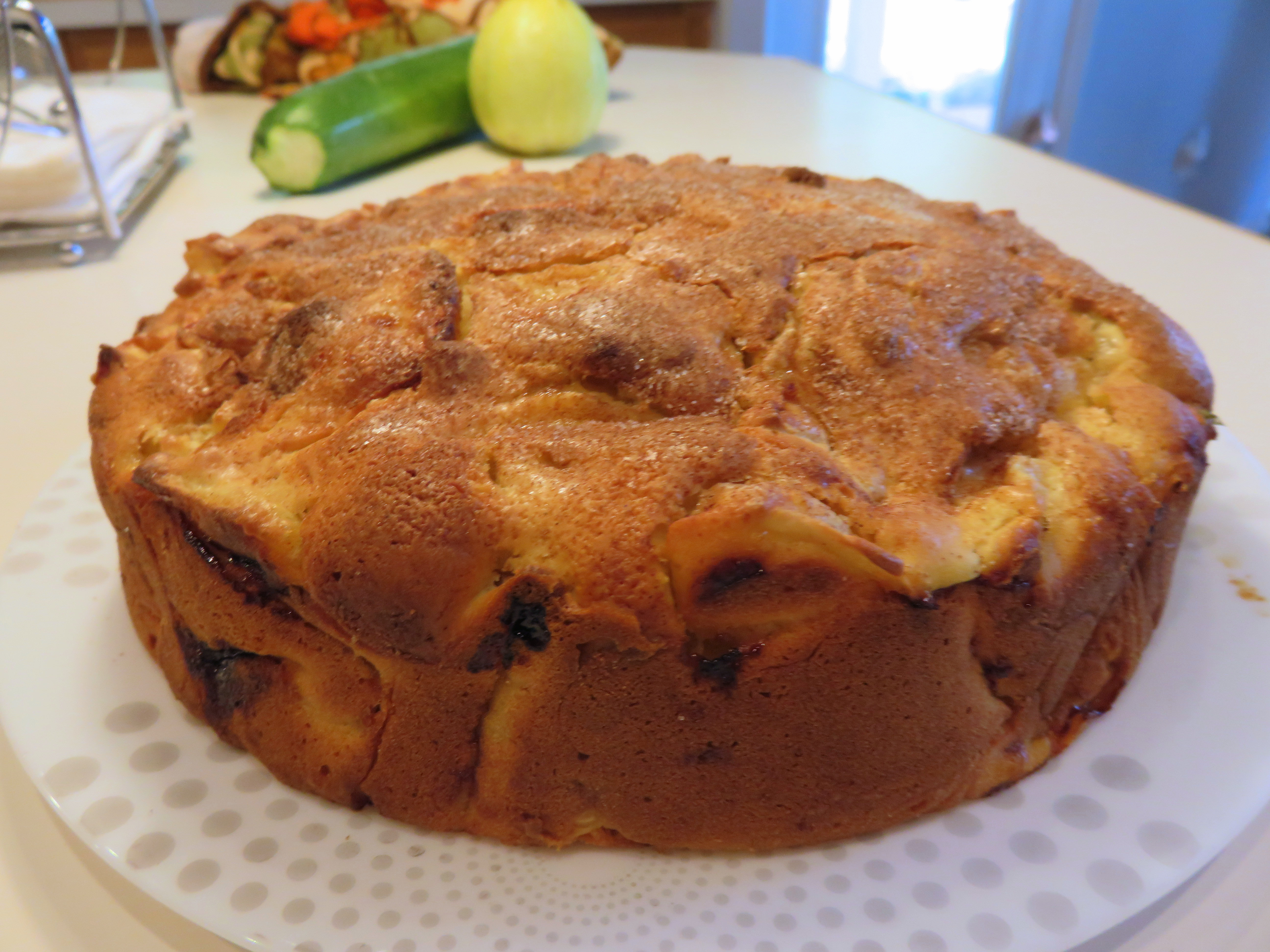 8 ounces plain flour 4 ounces sugar 1 teaspoon baking powder 3 eggs 3 tablespoons milk 1 teaspoon vanilla extract 2 1?2 ounces unsalted butter, melted 2 lbs apples or 2 lbs pears, peeled seeded, and chopped
