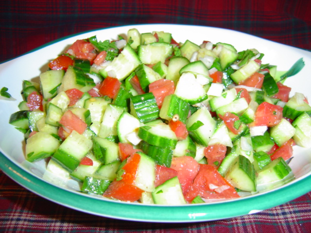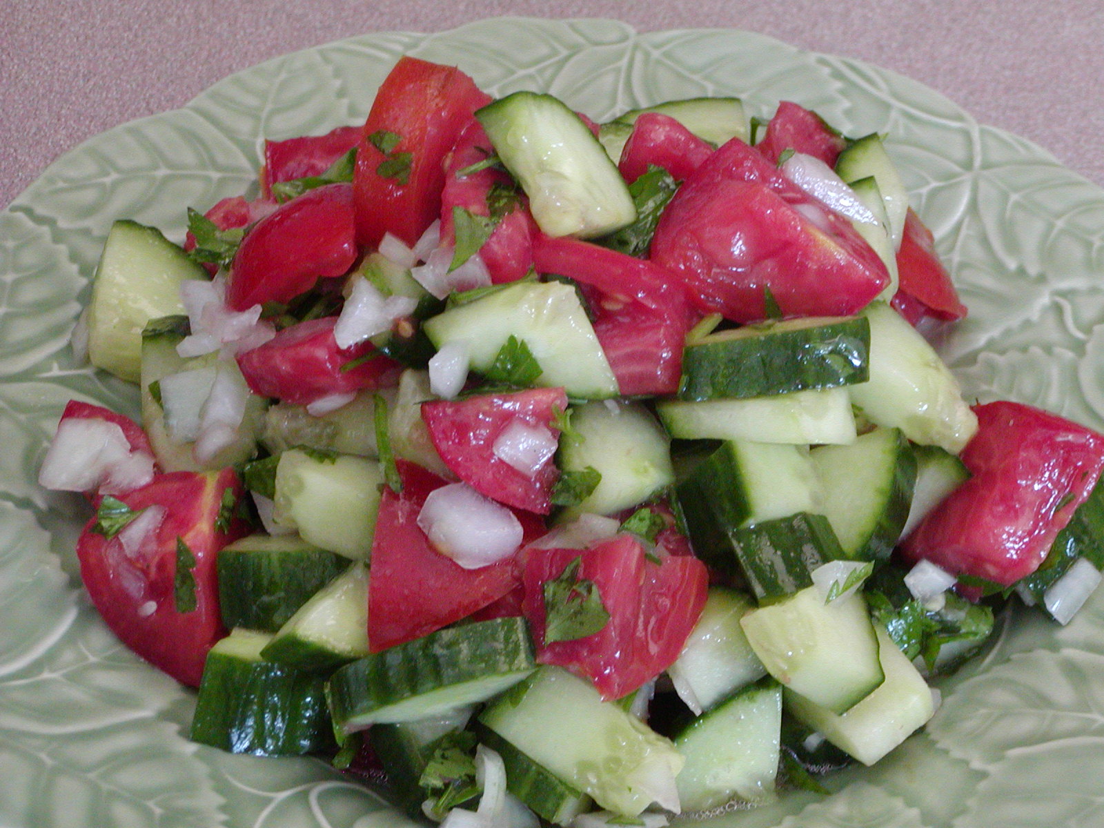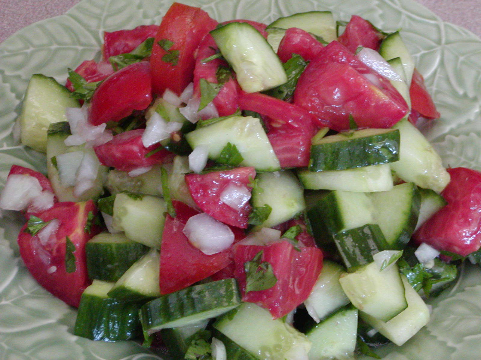 4 small English seedless cucumbers 4 medium tomatoes 1?2 cup finely chopped parsley 1 small finely diced onion (optional) 1 teaspoon salt 1 medium lemon, juice of 1 tablespoon olive oil (optional)