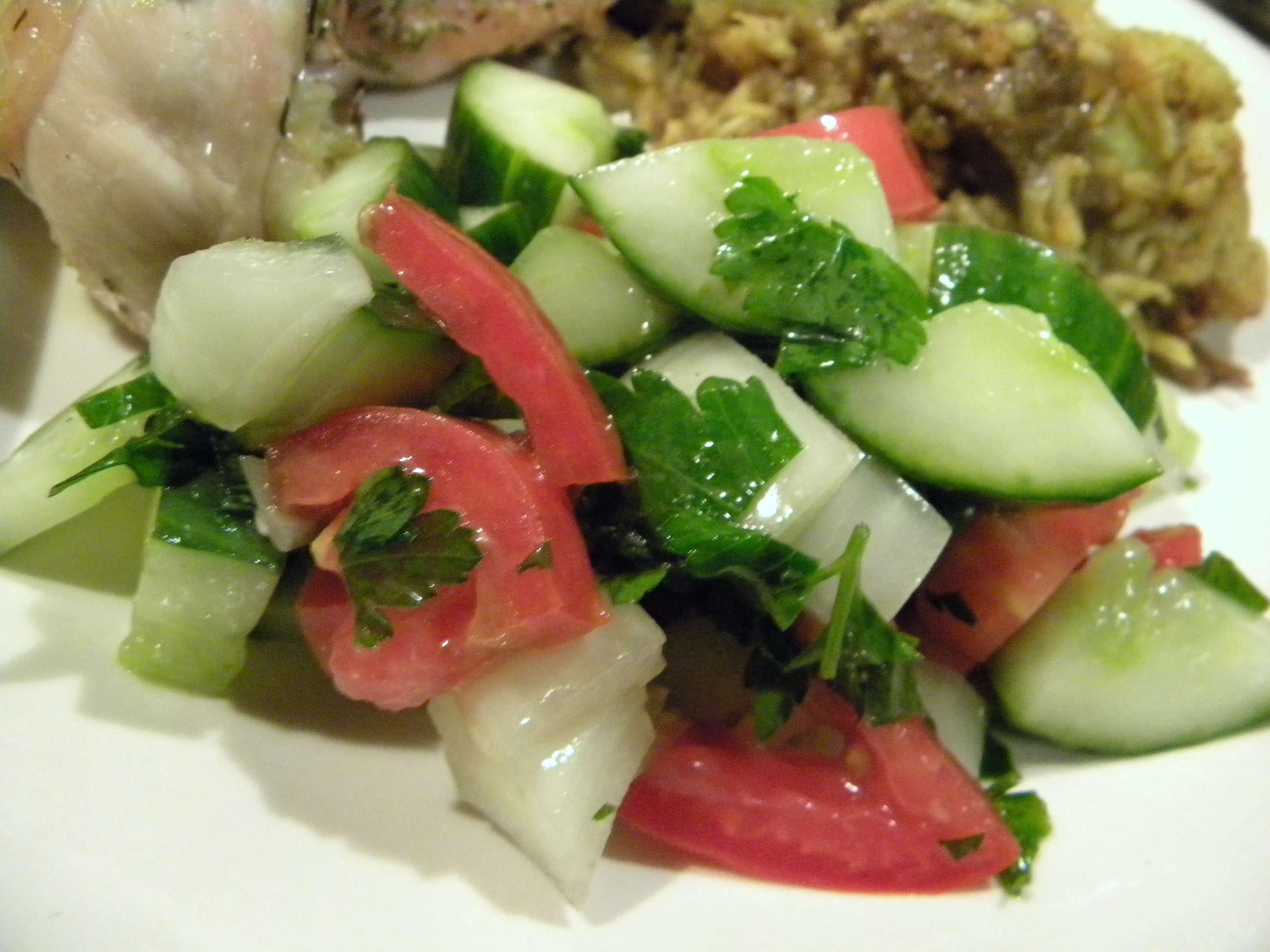 Dice cucumber and tomatoes. Place in bowl. Add parsley and onion. Just before serving, add the salt, lemon and olive oil and combine all ingredients. Serve in small bowls to accompany rice dishes.