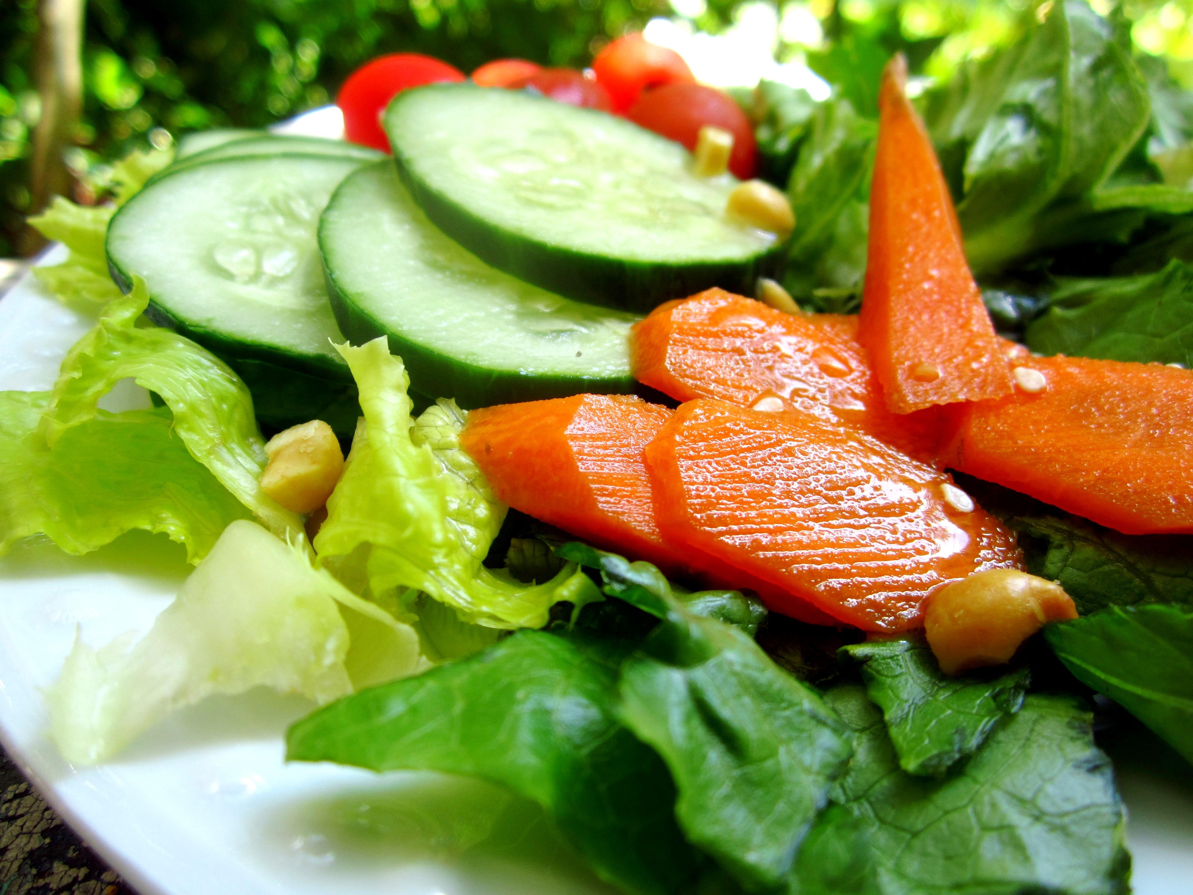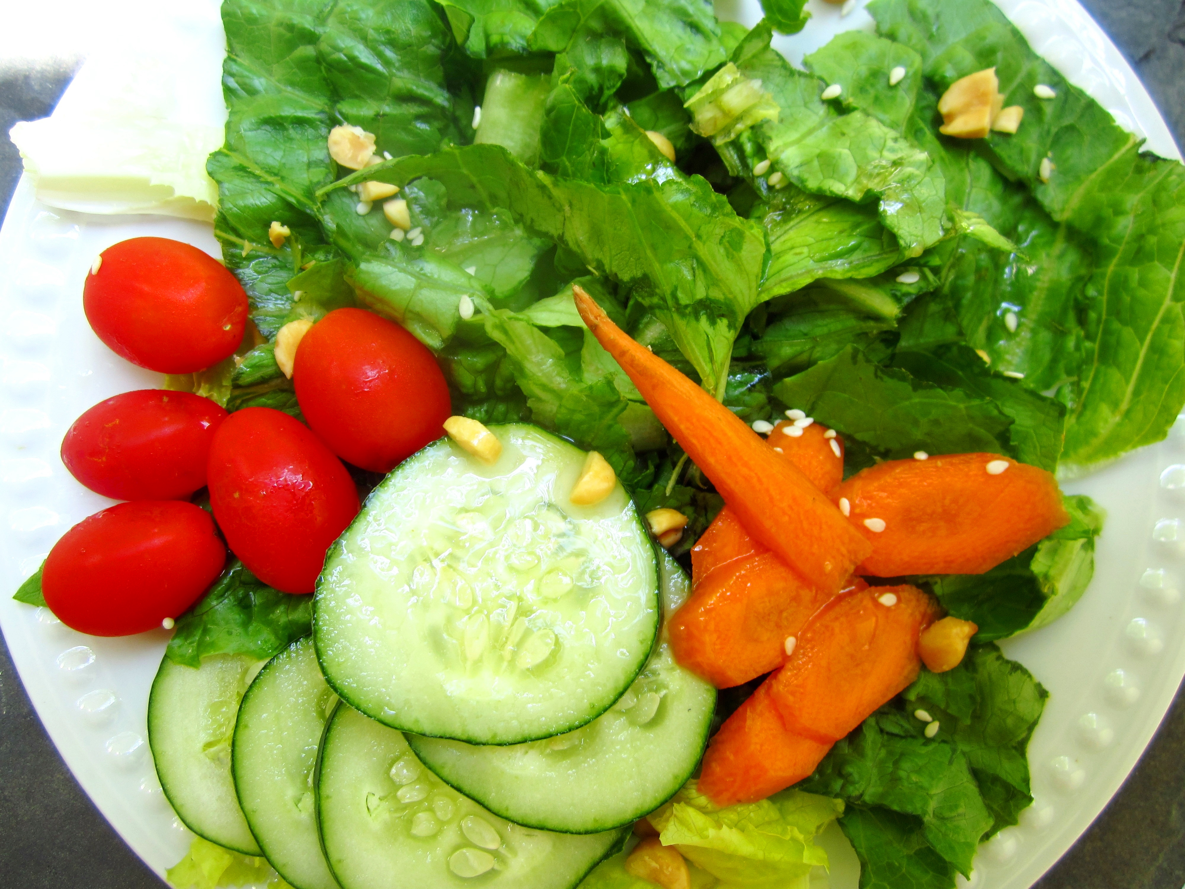 DRESSING 3 ounces rice vinegar 1 ounce Kikkoman soy sauce 1?4 teaspoon ground ginger 1 garlic clove, pressed 2 teaspoons sugar 7 ounces vegetable oil SALAD romaine lettuce or lettuce carrot, peeled and cut into slivers celery, slivered bean sprouts red peppers or green pepper, sliced chopped peanuts or cashews, toasted sesame seeds, toasted