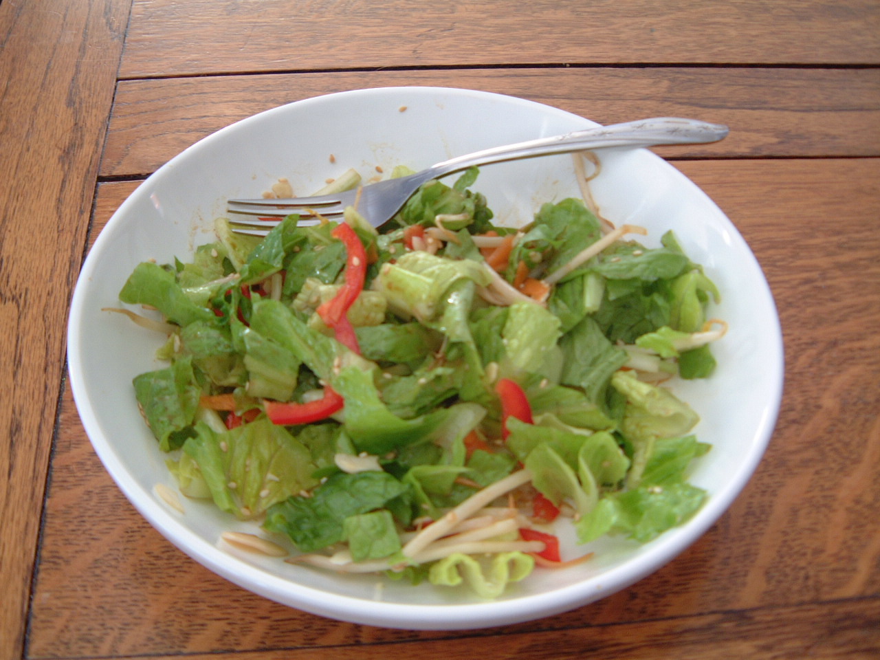 Mix dressing ingredients in a jar and shake. Wash and tear lettuce into a bowl, add carrots, peppers, celery to bowl and toss. Put dressing and bowl on table with bean sprouts, nuts and sesame seeds in individual bowls and tell your guests to create their own salad.