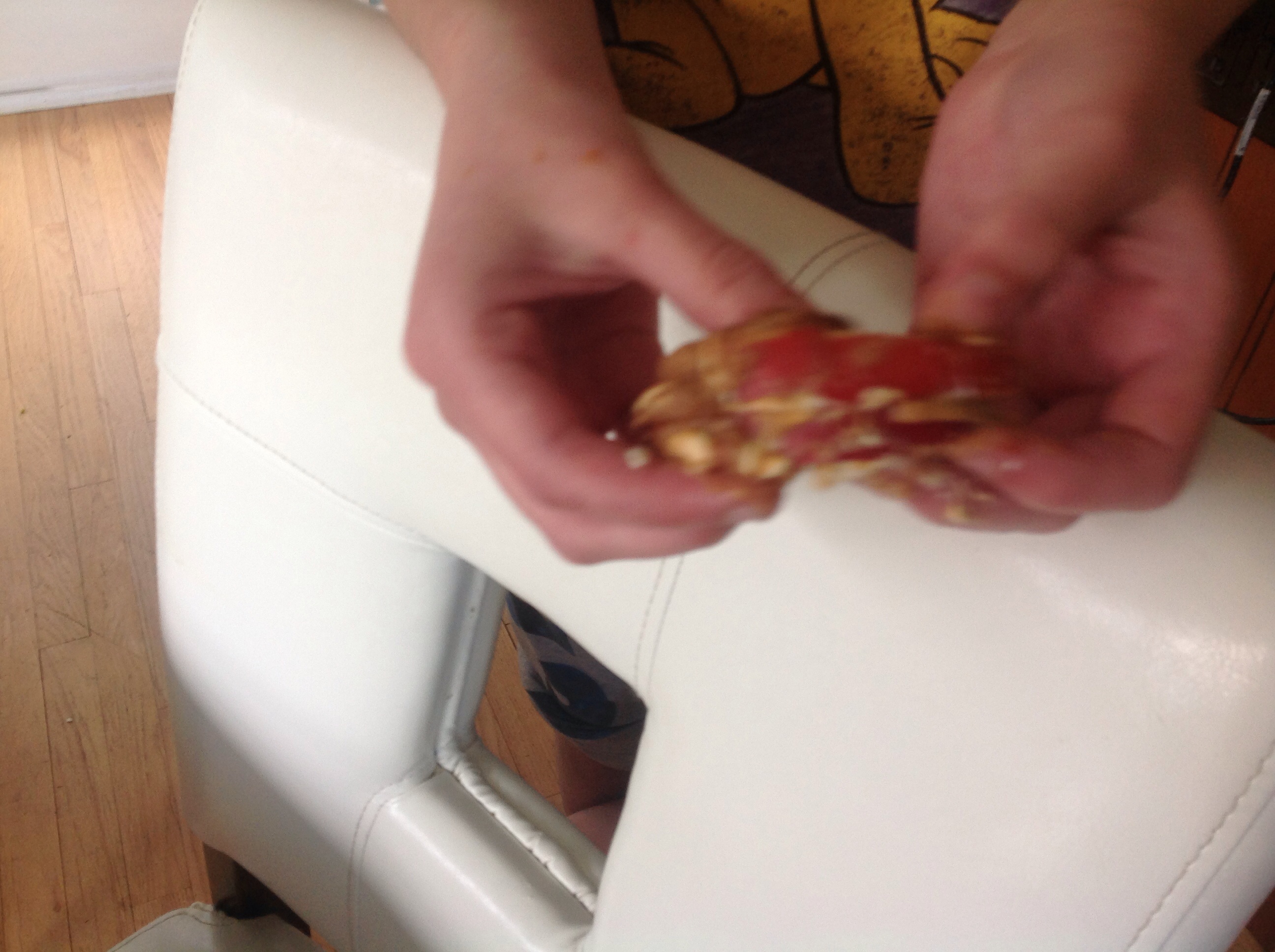 red apple, wash and core (do NOT peel!) peanut butter, smooth or chunky miniature marshmallow
