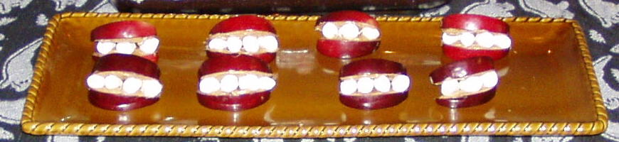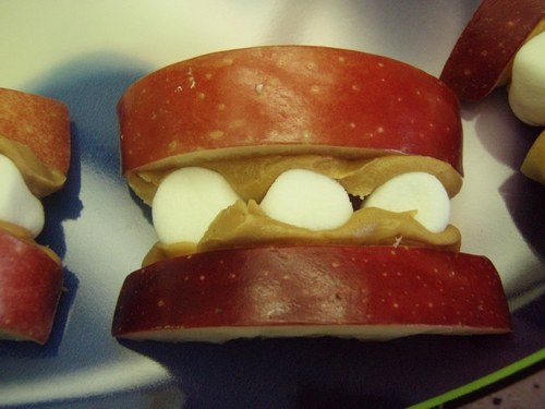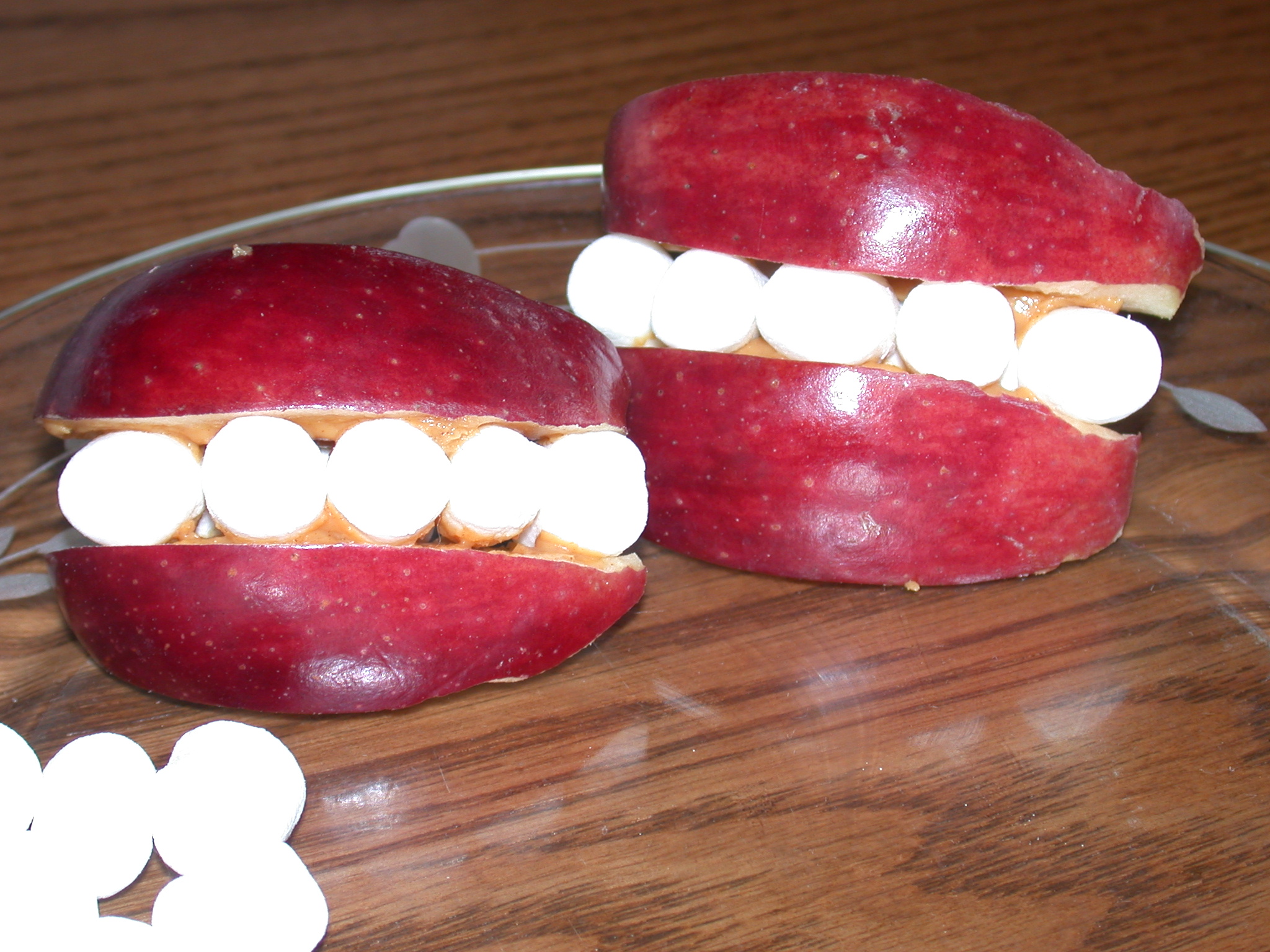 Cut apples into wedges, about 1/4-1/2" thick. On one wedge, spread peanut butter. Line up tiny marshmallows on top of peanut butter. Spread peanut butter on another wedge, and put on top of marshmallow wedge to make a smile (the stack will be apple, peanut butter, marshmallow, peanut butter, apple).