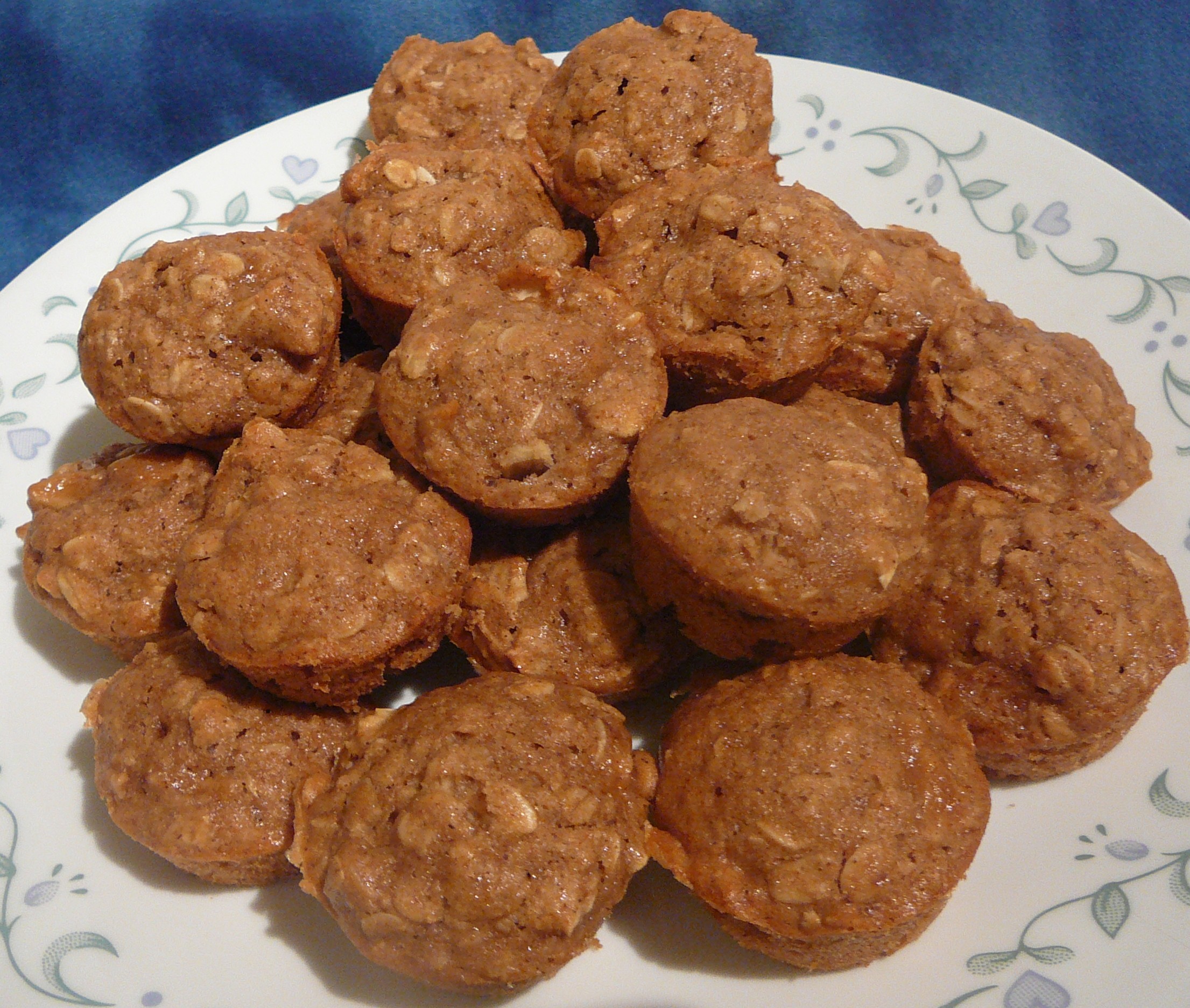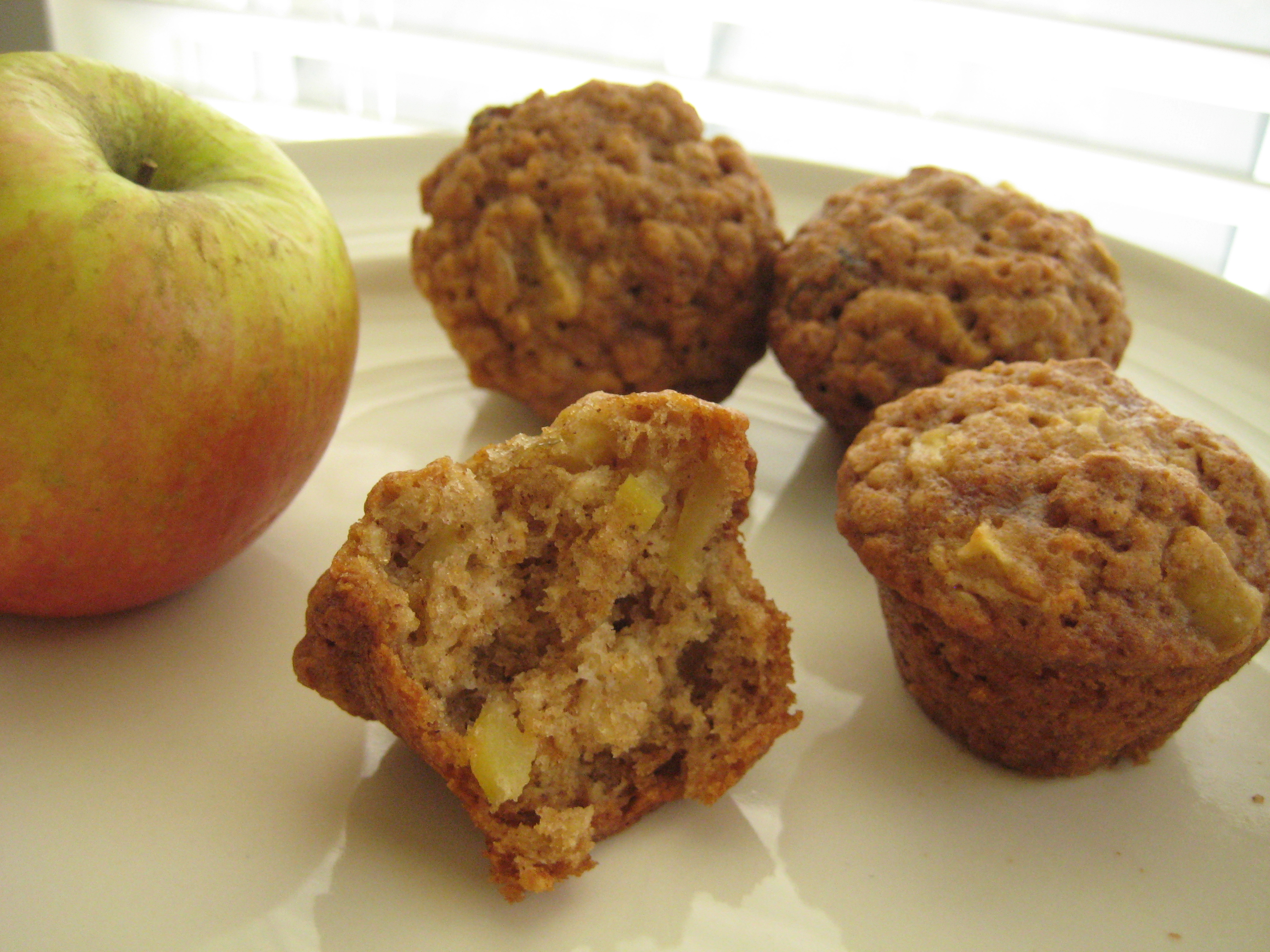 1 1?2 cups quick-cooking rolled oats 3?4 cup all-purpose flour 3?4 cup whole wheat flour 1?2 cup brown sugar, firmly packed 1 teaspoon baking powder 1?4 teaspoon baking soda 1?2 teaspoon salt 1 1?2 teaspoons cinnamon 1?2 cup raisins 1 cup finely chopped peeled apple (such as Granny Smith) 1 large egg, slightly beaten 1?2 cup honey 1?2 cup vegetable oil 1?3 cup milk
