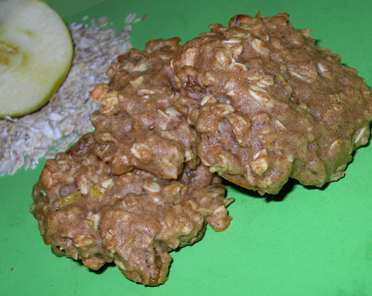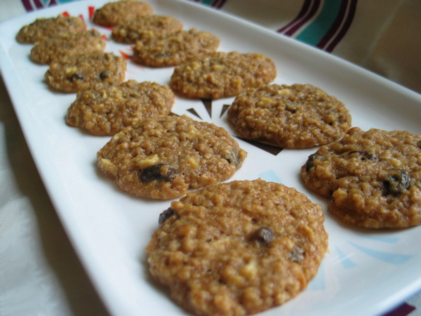 Preheat oven to 375F In a medium bowl, combine oats, all-purpose flour, whole wheat flour, brown sugar, baking powder, baking soda, salt and cinnamon. Stir to combine. Stir in raisins and apples. In a large bowl, combine egg, honey, oil and milk. Stir in dry ingredients. Mix to form a smooth batter. Drop batter onto ungreased baking sheets, using a rounded teaspoon of dough for each cookies, leaving 2 inches between. Dip fingers into water. Press dough down to about 1 1/2-inch diameter Bake for 10-12 minutes, or until lightly golden Remove sheet from oven. Transfer cookies to cooling rack.