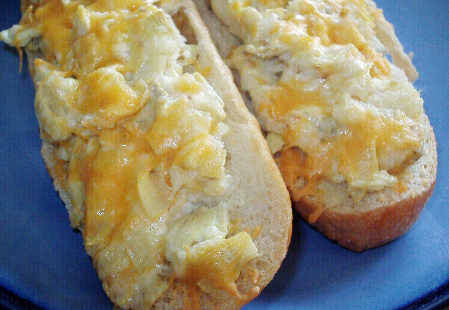 Preheat over to 350F. Melt butter in a skillet over medium heat. Add garlic and sesame seeds. Saut until lightly browned. Remove from heat and stir in artichoke, Monterey jack, parmesan and sour cream. Cut bread in half lengthwise. Scoop out center of each piece, leaving a 1 inch shell. Add approximately 1/2 of the removed bread pieces to the artichoke mixture. Stir to blend. Spoon artichoke mixture into french bread shells and sprinkle with cheddar cheese. Place on baking sheet and cover with foil. Bake for 25 minutes. Remove foil and bake 5 minutes more. Cool slightly and cut into slices.