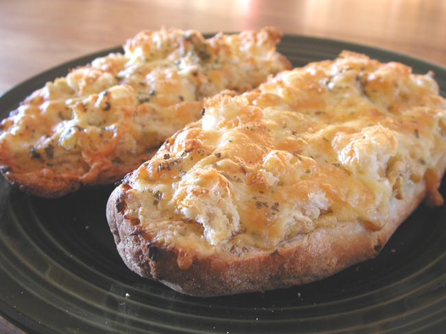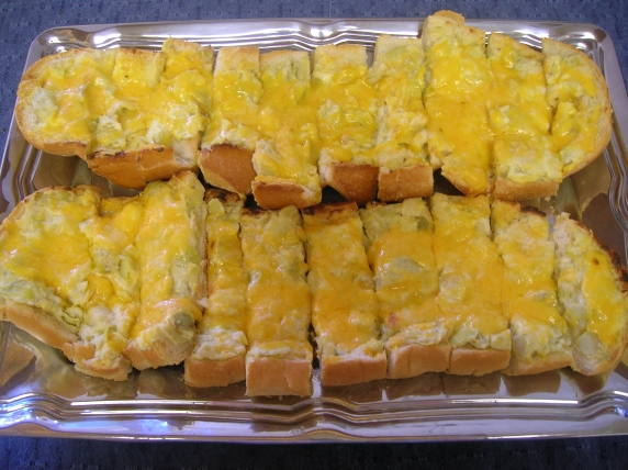 1?4 cup butter 2 -3 garlic cloves, minced 2 teaspoons sesame seeds 1 (14 ounce) can artichoke hearts, drained & chopped 1 cup shredded monterey jack cheese 1 cup grated parmesan cheese 1 cup sour cream 1 loaf French bread 1?2 cup shredded cheddar cheese (I prefer sharp)