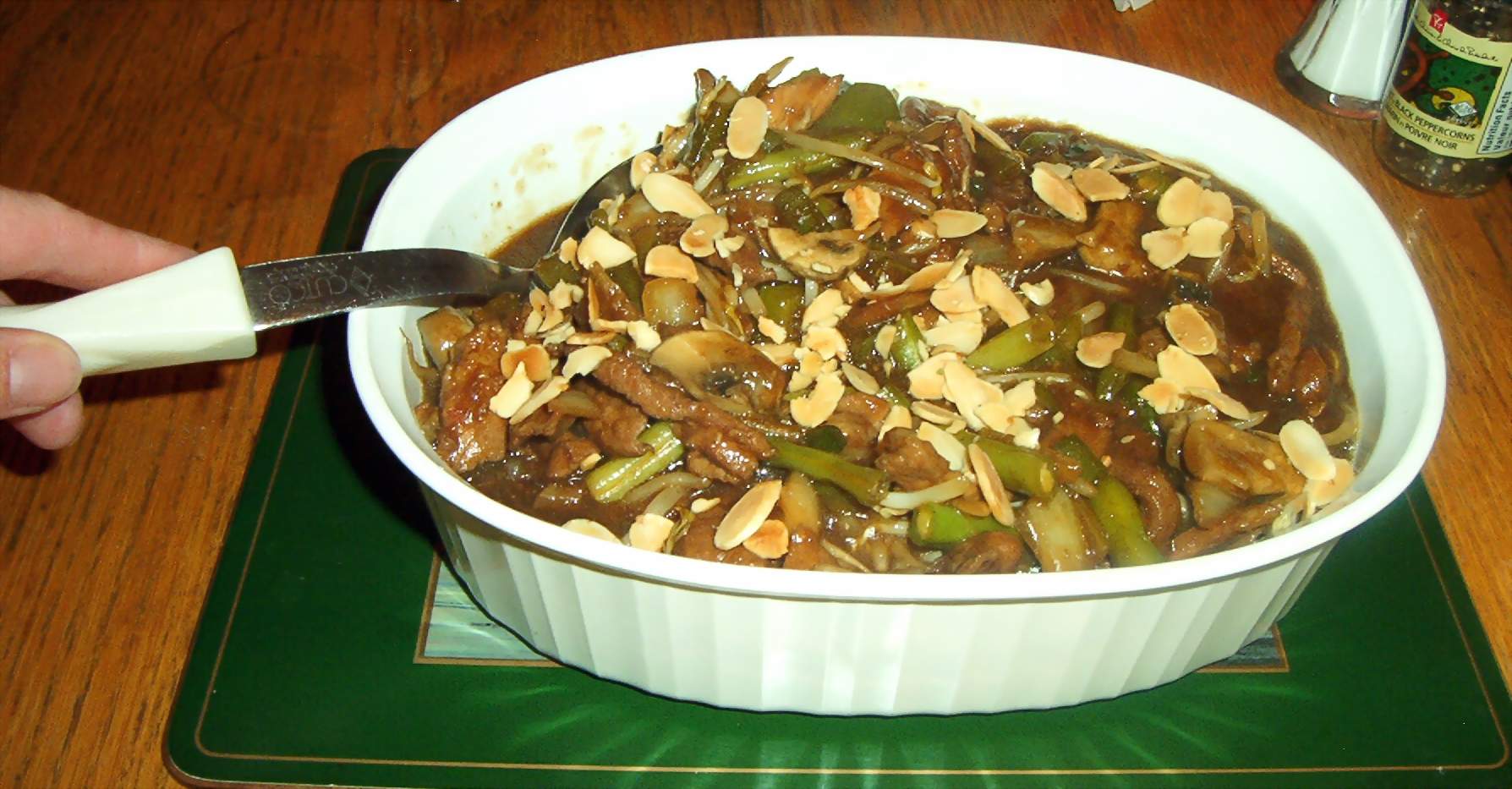 1 1?2 lbs lean pork, thinly sliced 3 garlic cloves, chopped (optional) 1?4 cup cornstarch 2 teaspoons sugar 5 tablespoons soy sauce (divided, more is desired) 2 tablespoons vegetable oil 2 tablespoons shortening 1 3?4 cups water, divided 2 stalks celery, diced 1 large onion, chopped 1 tablespoon molasses (do NOT omit) 1 (8 ounce) can sliced water chestnuts 1 lb bean sprouts (or more) 1 (4 ounce) can mushrooms, drained salt and pepper 1 bunch green onion (optional) blanched almond, lightly toasted