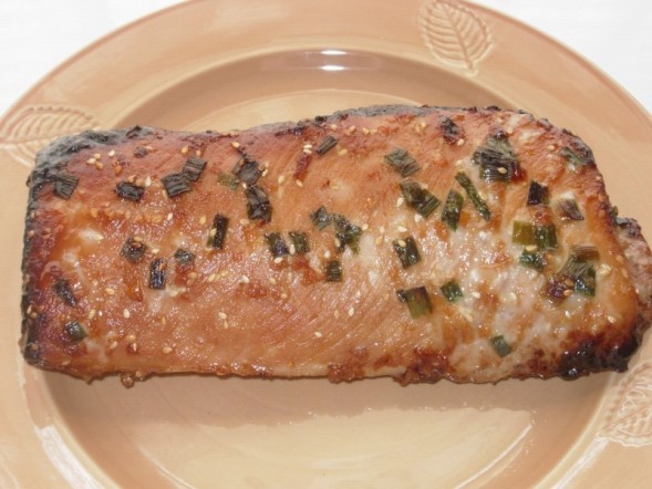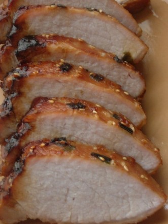 1 1?2 lbs pork tenderloin 1 teaspoon honey 1 teaspoon molasses 2 cloves garlic, minced 1 teaspoon minced fresh gingerroot 1 teaspoon light soy sauce 1?2 teaspoon sesame oil 1 teaspoon sesame seeds 2 teaspoons sliced green onions