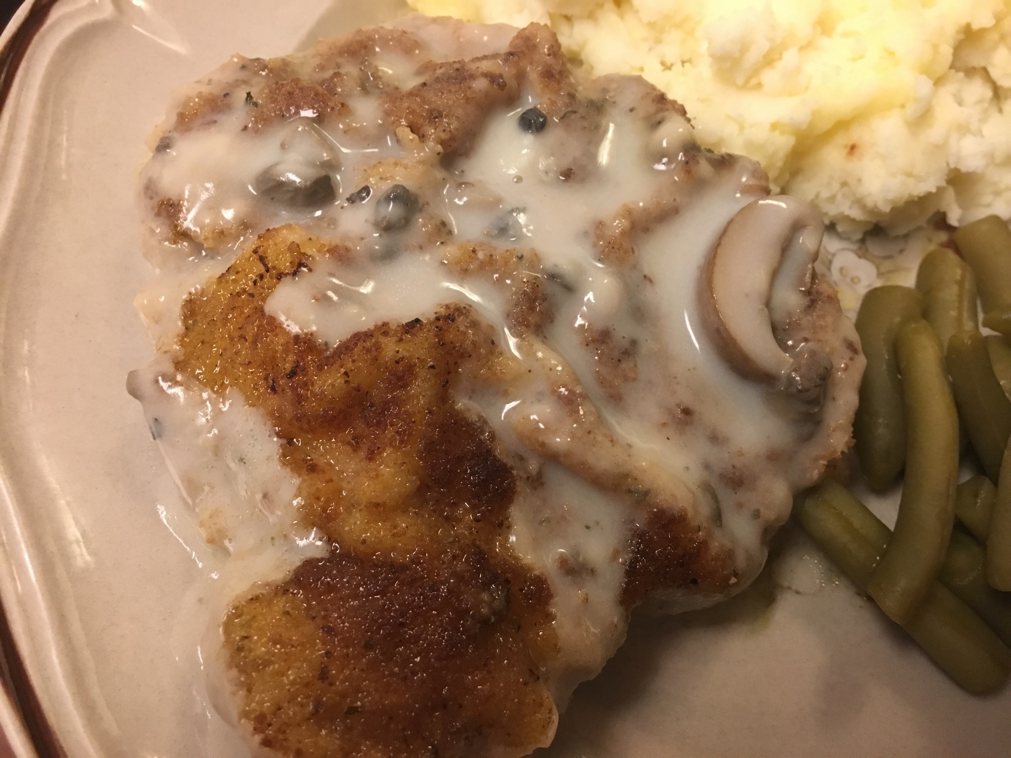 6 pork chops 1 teaspoon garlic powder 1 teaspoon seasoning salt 2 eggs, beaten 1?4 cup all-purpose flour 2 cups Italian style breadcrumbs 4 tablespoons olive oil 1 (10 3/4 ounce) can condensed cream of mushroom soup 1?2 cup milk 1?3 cup white wine