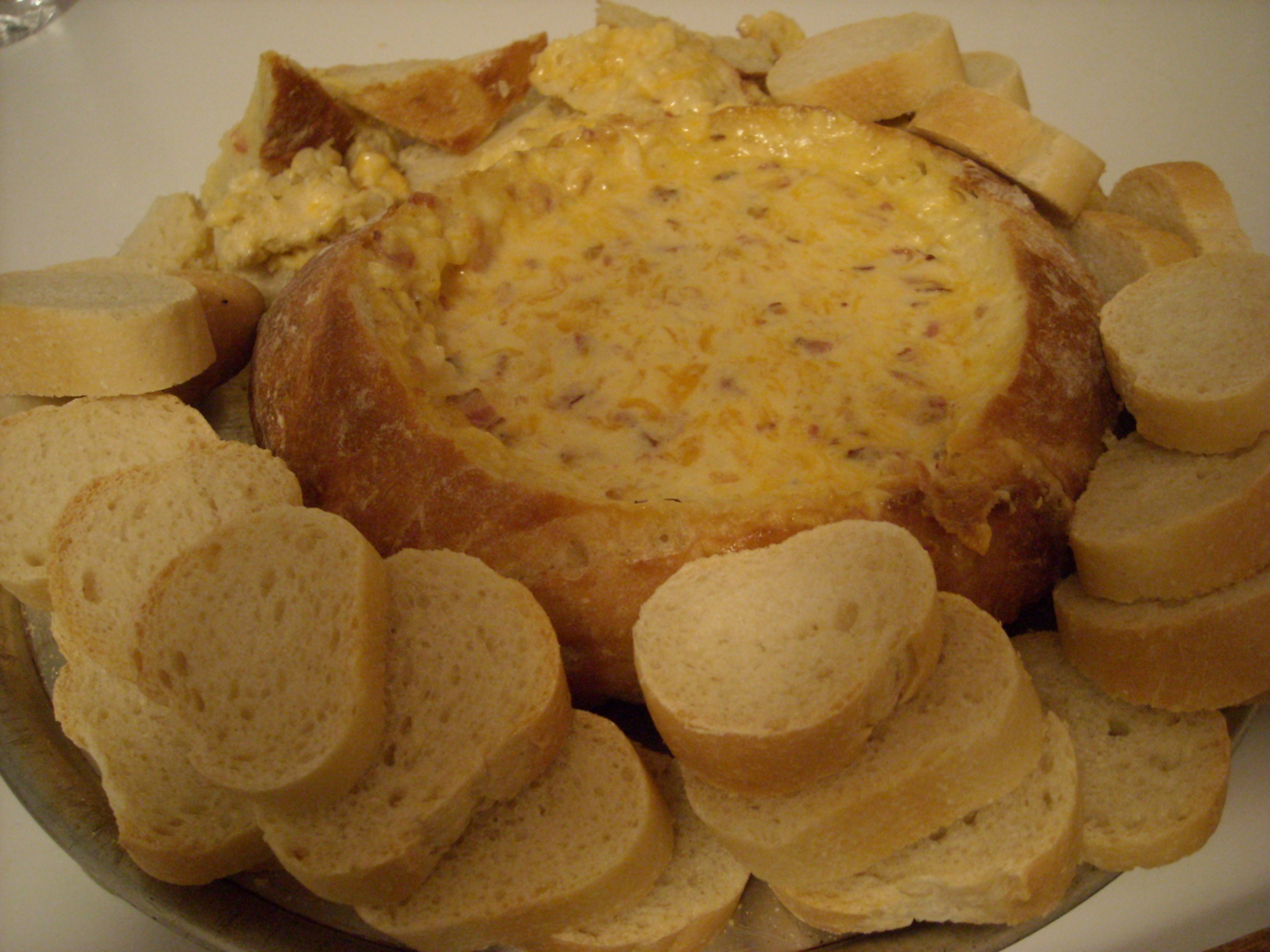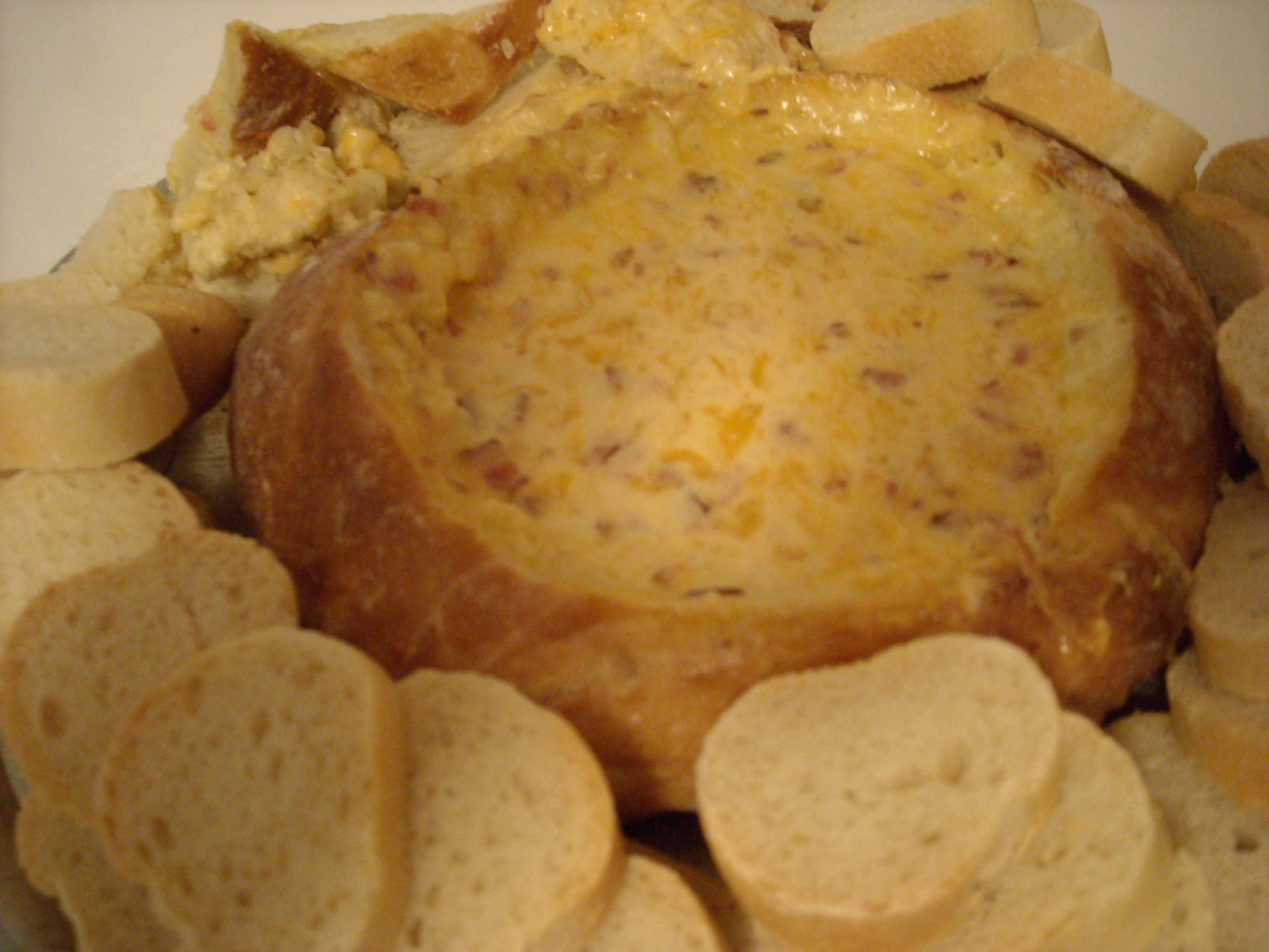 Hollow out top of bread for the"bowl". Save removed bread for other use. Mix together the cheese and other ingredients. Fill bread bowl. Bake at 350 for 40 minutes, until hot and bubbly. Serve hot.