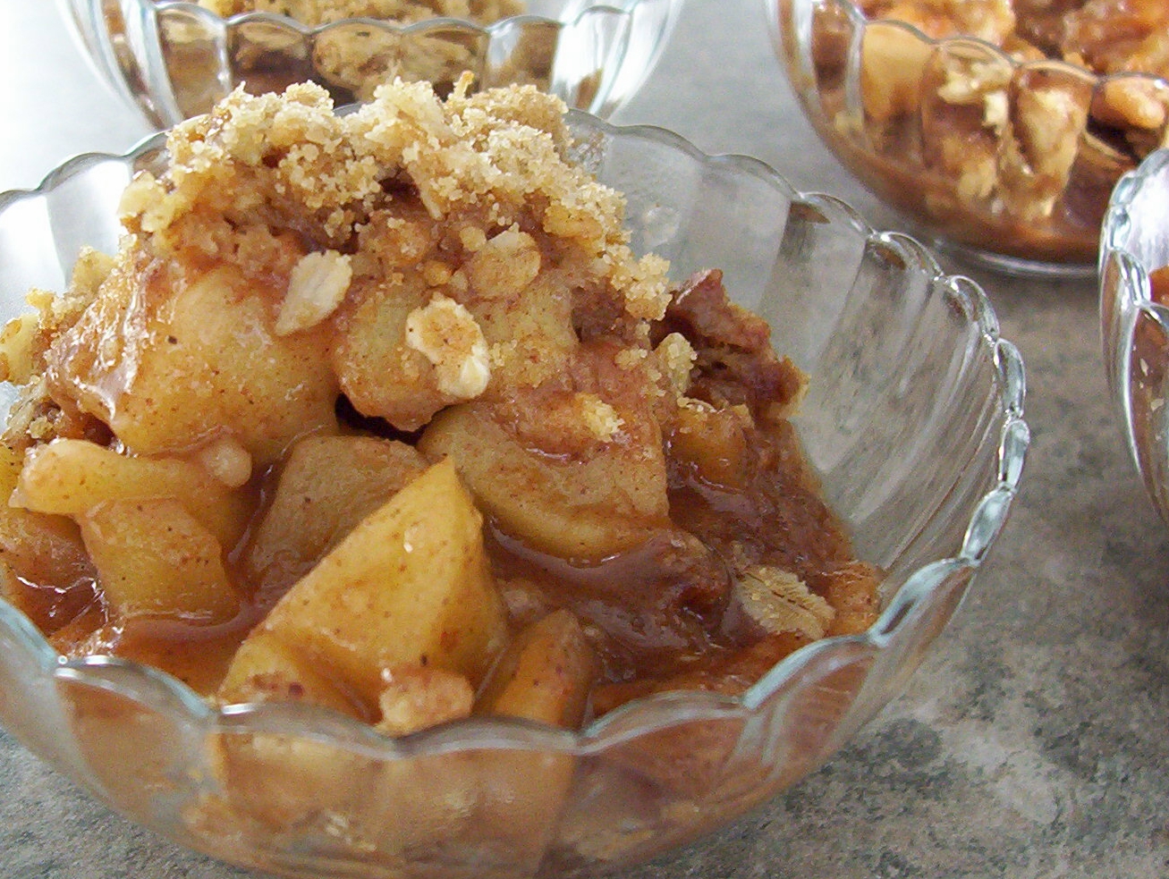 FRUIT FILLING 10 cups thinly sliced apples 1 cup sugar 1 tablespoon flour 1 teaspoon cinnamon 1?2 cup water (I may try omitting the water next time) 2 tablespoons lemon juice (optional) TOPPING 1 cup rolled oats 1 cup flour 1 cup brown sugar 1?4 teaspoon baking powder 1?4 teaspoon baking soda 1?2 cup melted butter
