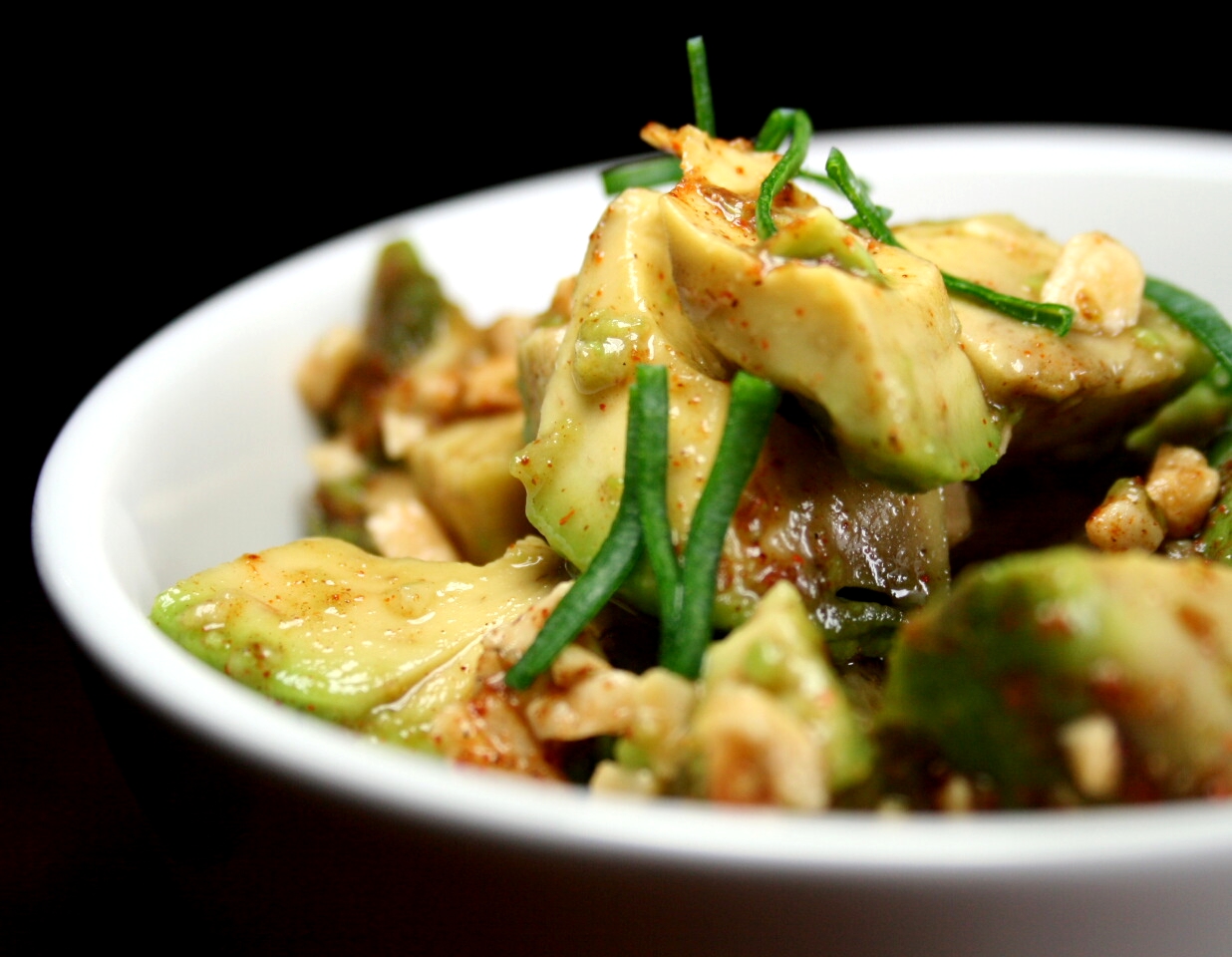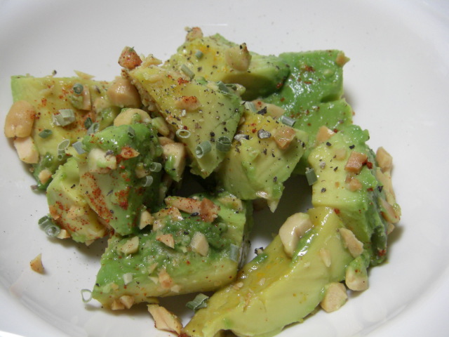 Peel the avocados, remove the pit and cube the flesh. Place in a bowl with lemon juice. Grind the peanuts so you have small chunks. Sprinkle the nuts and spices over the avocado and toss gently. Garnish with chopped chives.