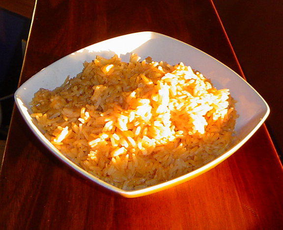 in a bowl combine broth, cumin, chili powder, salt & half a can of el pato sauce (if you can't find el pato use regular tomato sauce). brown rice, in hot oil, in a large skillet for approximately 5 minutes flipping occasionally. add diced onion, minced garlic, saut for 1 minute. add seasoned broth, bring to a boil. reduce heat to low, cover and simmer for 15 minutes. do not check on the rice before the 15 minutes is up, this will allow steam to escape and may make your rice turn out undercooked. most of the water will absorb before the 15 minute time limit but keep covered and continue to steam for the entire 15 minutes. this will make for perfect rice that isnt crunchy. after 15 minutes turn heat off, uncover & flip rice over. recover & let sit until everything else is ready. you can let the rice sit covered for up to 25 minutes which will cook out most of the moisture & leave perfect fluffy rice.