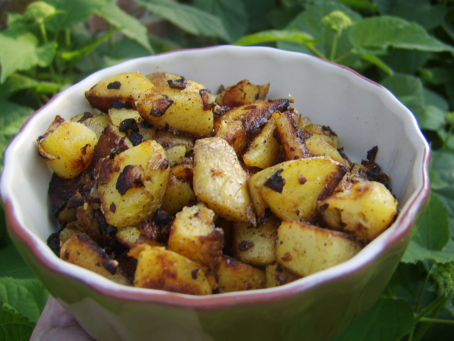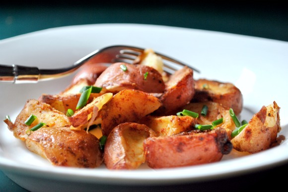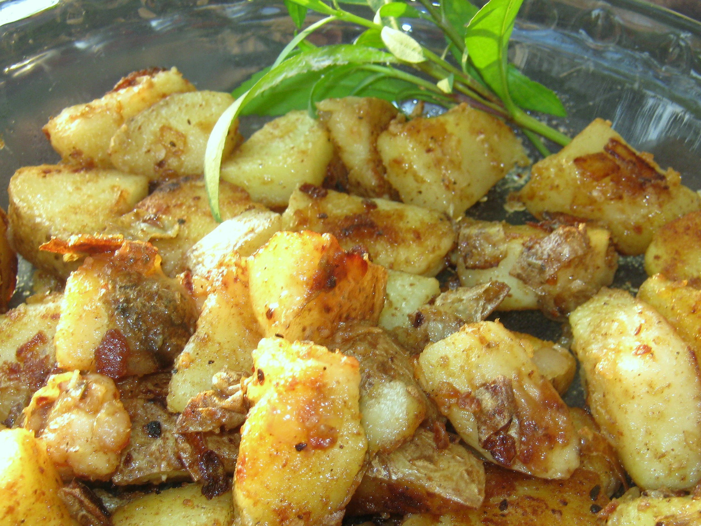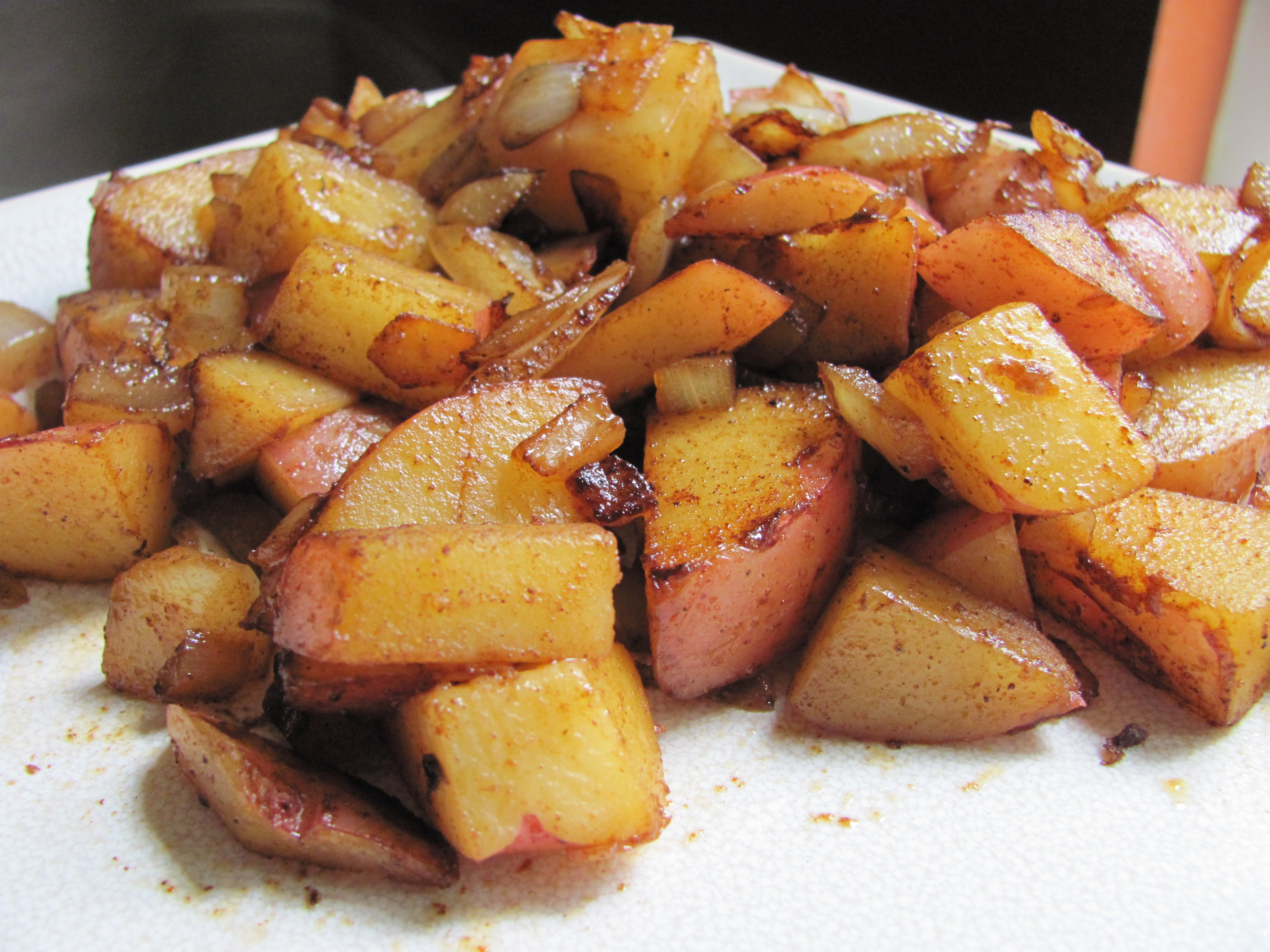 Microwave potatoes for 5-6 minutes to soften. Cut potatoes into bite size pieces(about 1 inch cubes). Dice onion. Spray large frying pan with olive oil and add potatoes, onions,paprika and garlic adding more oil as needed to brown the potatoes. Cook on medium heat until tender and browned. When done, add white wine and salt and pepper to taste.